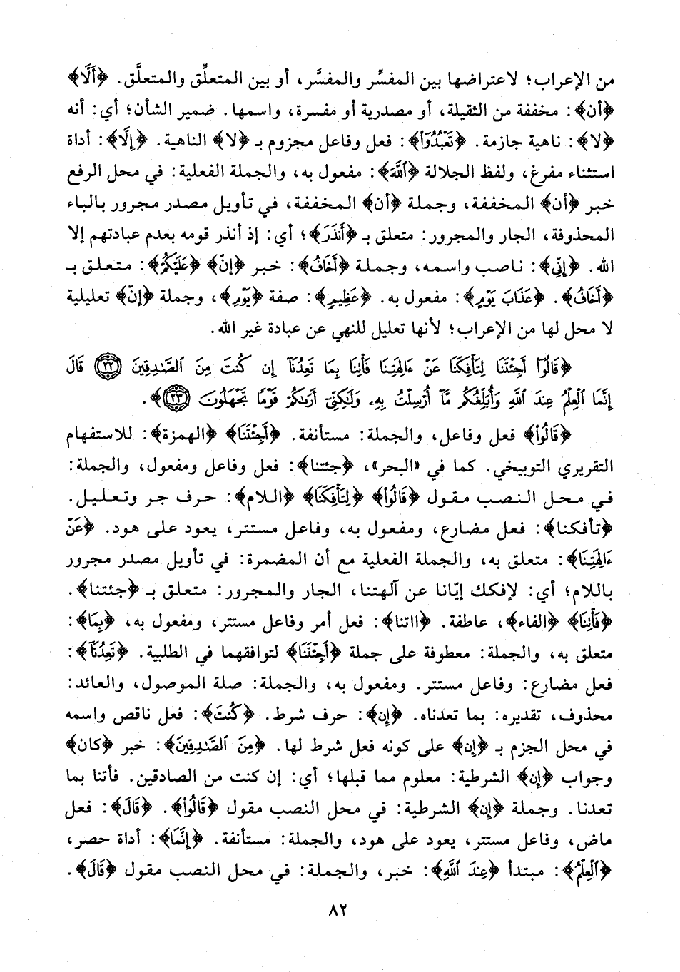 {قَالُوا} فعل وفاعل، والجملة: مستأنفة. {أَجِئْتَنَا} {الهمزة}: للاستفهام التقريري التوبيخي. كما في "البحر"، {جئتنا}: فعل وفاعل ومفعول، والجملة: في محل النصب مقول {قَالُوا} {لِتَأْفِكَنَا} {اللام}: حرف جر وتعليل. {تأفكنا}: فعل مضارع، ومفعول به، وفاعل مستتر، يعود على هود. {عَنْ آلِهَتِنَا}: متعلق به، والجملة الفعلية مع أن المضمرة: في تأويل مصدر مجرور باللام؛ أي: لإفكك إيّانا عن آلهتنا، الجار والمجرور: متعلق بـ {جئتنا}. {فَأْتِنَا} {الفاء}، عاطفة. {ااتنا}: فعل أمر وفاعل مستتر، ومفعول به، {بِمَا}: متعلق به، والجملة: معطوفة على جملة {أَجِئْتَنَا} لتوافقهما في الطلبية. {تَعِدُنَا}: فعل مضارع: وفاعل مستتر. ومفعول به، والجملة: صلة الموصول، والعائد: محذوف، تقديره: بما تعدناه. {إِن}: حرف شرط. {كنُتَ}: فعل ناقص واسمه في محل الجزم بـ {إِن} على كونه فعل شرط لها. {مِنَ الصَّادِقِينَ}: خبر {كان} وجواب {إِن} الشرطية: معلوم مما قبلها؛ أي: إن كنت من الصادقين. فأتنا بما تعدنا. وجملة {إِن} الشرطية: في محل النصب مقول {قَالُوا}. {قَالَ}: فعل ماض، وفاعل مستتر، يعود على هود، والجملة: مستأنفة. {إِنَّمَا}: أداة حصر، {الْعِلْمُ}: مبتدأ {عِنْدَ اللهِ}: خبر، والجملة: في محل النصب مقول {قَالَ}.