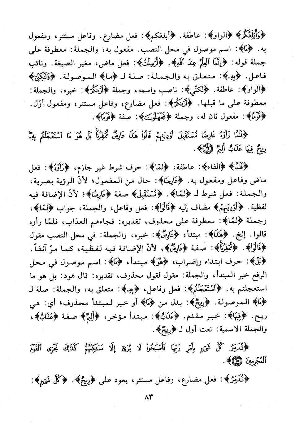 {فَلَمَّا} {الفاء}: عاطفة، {لمّا}: حرف شرط غير جازم، {رَأَوْهُ}: فعل ماض وفاعل ومفعول به. {عَارِضًا}: حال من المفعول؛ لأنّ الرؤية بصرية، والجملة: فعل شرط لـ {لمّا}. {مُسْتَقْبِلَ} صفة {عَارِضًا}؛ لأنّ الإضافة فيه لفظية. {أَوْدِيَتِهِمْ} مضاف إليه {قَالُوا}: فعل وفاعل، والجملة، جواب {لمّا}، وجملة {لمّا}: معطوفة على محذوف، تقديره: فجاءهم العذاب، فلمّا رأوه قالوا. إلخ. {هَذَا}: مبتدأ، {عَارِضٌ}: خبره، والجملة: في محل النصب مقول {قَالُوا}. {مُمْطِرُنَا}: صفة {عَارِضٌ}؛ لأنّ الإضافة فيه لفظية، كما مرّ آنفًا. {بَل}: حرف ابتداء وإضراب، {هُوَ} مبتدأ، {مَا}: اسم موصول في محل الرفع خبر المبتدأ، والجملة: مقول لقول محذوف، تقديره: قال هود: بل هو ما استعجلتم به. {اسْتَعْجَلْتُمْ}: فعل وفاعل، {بِهِ}: متعلق به، والجملة: صلة لـ {مَا} الموصولة. {رِيحٌ}: بدل من {مَا} أو خبر لمبتدأ محذوف؛ أي: هي ريح. {فِيهَا}: خبر مقدم. {عَذَابٌ}: مبتدأ مؤخر، {أَلِيمٌ} صفة {عَذَابٌ}، والجملة الاسمية: نعت أول لـ {رِيحٌ}.