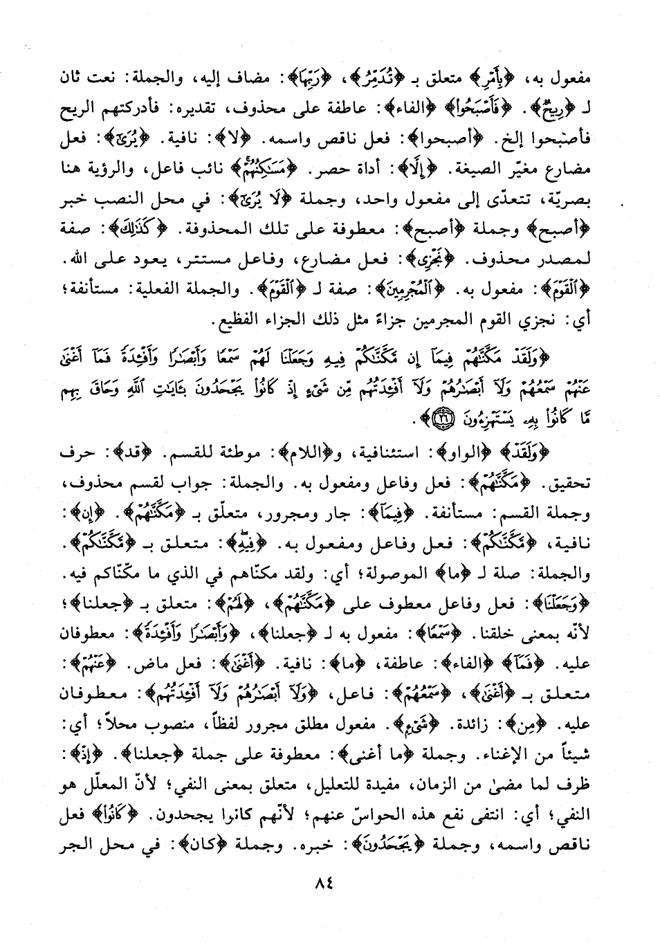 {وَلَقَدْ} {الواو}: استئنافية، و {اللام}: موطئة للقسم. {قد}: حرف تحقيق. {مَكَّنَّاهُمْ}: فعل وفاعل ومفعول به. والجملة: جواب لقسم محذوف، وجملة القسم: مستأنفة. {فِيمَا}: جار ومجرور، متعلّق بـ {مَكَّنَّاهُمْ}. {إِن}: نافية، {مَكَّنَّاكُمْ}: فعل وفاعل ومفعول به. فِيه: متعلق بـ {مَكَّنَّاكُمْ} والجملة: صلة لـ {ما} الموصولة؛ أي: ولقد مكنَّاهم في الذي ما مكّناكم فيه. {وَجَعَلْنَا}: فعل وفاعل معطوف على {مَكَّنَّاهُمْ}، {لَهُمْ}: متعلق بـ {جعلنا}؛ لأنّه بمعنى خلقنا. {سَمْعًا}: مفعول به لـ {جعلنا}، {وَأَبْصَارًا وَأَفْئِدَةً}: معطوفان عليه. {فَمَا} {الفاء}: عاطفة، {ما}: نافية. {أَغْنَى}: فعل ماض. {عَنْهُمْ}: متعلق بـ {أَغْنَى}، {سَمْعُهُمْ}: فاعل، {وَلَا أَبْصَارُهُمْ وَلَا أَفْئِدَتُهُمْ}: معطوفان عليه. {مِنْ}: زائدة. {شَيْءٍ}. مفعول مطلق مجرور لفظًا، منصوب محلًا؛ أي: شيئًا من الإغناء. وجملة {ما أغنى}: معطوفة على جملة {جعلنا}. {إِذْ}: ظرف لما مضى من الزمان، مفيدة للتعليل، متعلق بمعنى النفي؛ لأنّ المعلّل هو النفي؛ أي: انتفى نفع هذه الحواس عنهم؛ لأنّهم كانوا يجحدون. {كَانُوا} فعل ناقص واسمه، وجملة {يَجْحَدُونَ}: خبره. وجملة {كان}: في محل الجر