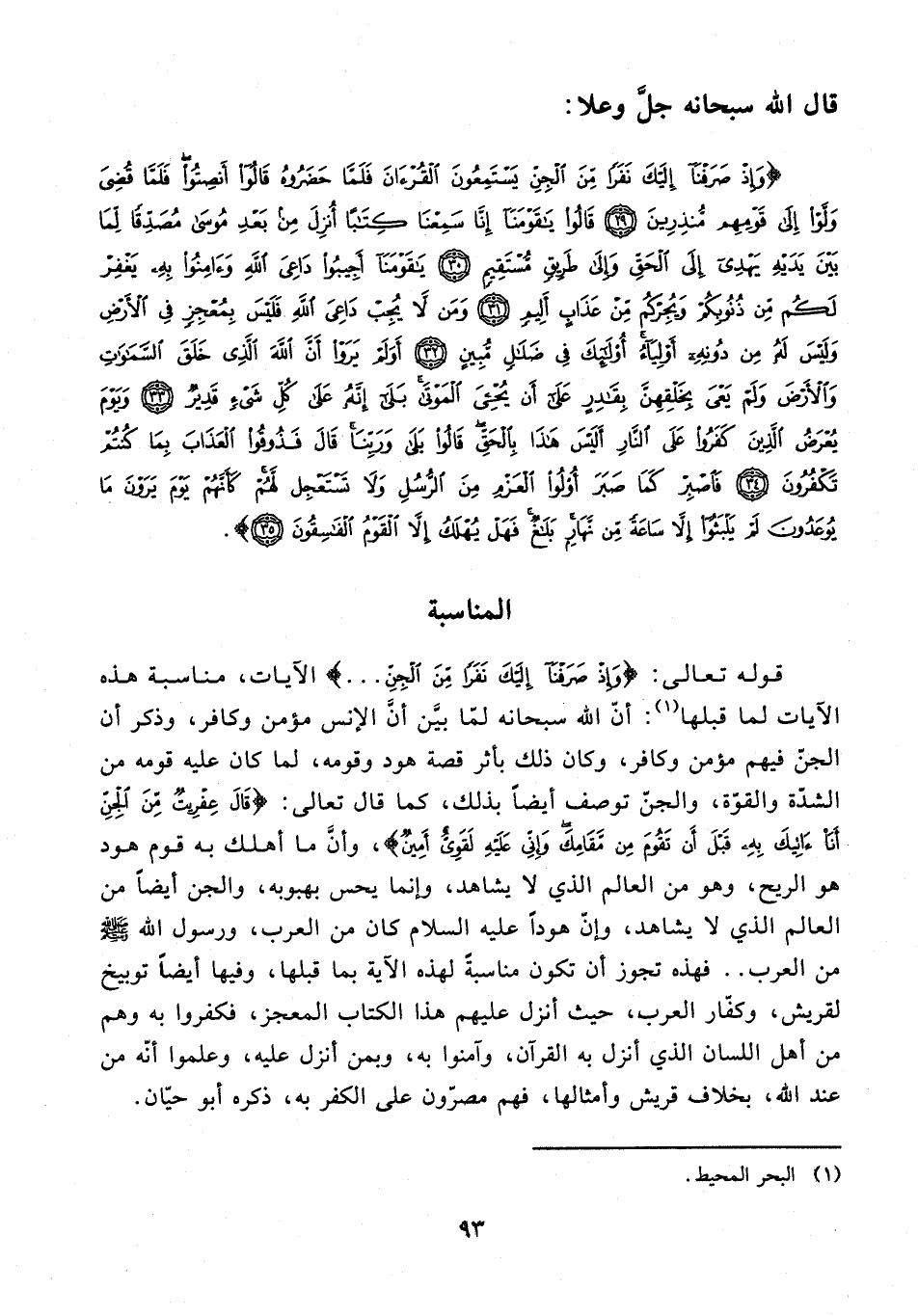 قوله تعالى: {وَإِذْ صَرَفْنَا إِلَيْكَ نَفَرًا مِنَ الْجِنِّ ...} الآيات، مناسبة هذه الآيات لما قبلها (¬1): أن الله سبحانه لمّا بيَّن أنَّ الإنس مؤمن وكافر، وذكر أن الجنّ فيهم مؤمن وكافر، وكان ذلك بأثر قصة هود وقومه، لما كان عليه قومه من الشدّة والقوّة، والجنّ توصف أيضًا بذلك، كما قال تعالى: {قَالَ عِفْرِيتٌ مِنَ الْجِنِّ أَنَا آتِيكَ بِهِ قَبْلَ أَنْ تَقُومَ مِنْ مَقَامِكَ وَإِنِّي عَلَيْهِ لَقَوِيٌّ أَمِينٌ}، وأنَّ ما أهلك به قوم هود هو الريح، وهو من العالم الذي لا يشاهد، وإنما يحيى بهبوبه، والجن أيضًا من العالم الذي لا يشاهد، وإن هودًا عليه السلام كان من العرب، ورسول الله - صلى الله عليه وسلم - من العرب .. فهذه تجوز أن تكون مناسبةً لهذه الآية بما قبلها، وفيها أيضًا توبيخ لقريش، وكفّار العرب، حيث أنزل عليهم هذا الكتاب المعجز، فكفروا به وهم من أهل اللسان الذي أنزل به القرآن، وآمنوا به، وبمن أنزل عليه، وعلموا أنّه من عند الله، بخلاف قريش وأمثالها، فهم مصرّون على الكفر به، ذكره أبو حيّان.