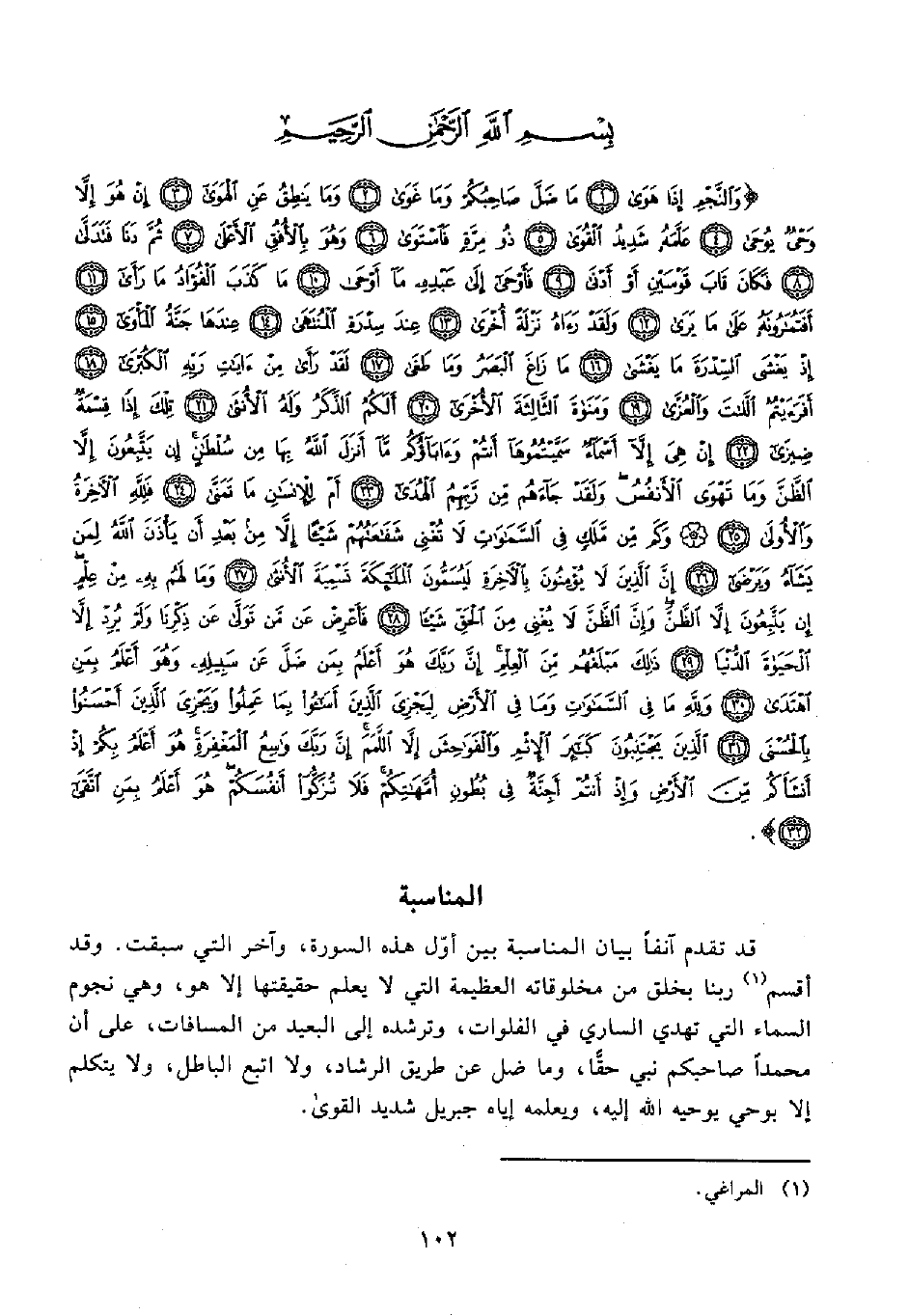 {وَالنَّجْمِ إِذَا هَوَى (1) مَا ضَلَّ صَاحِبُكُمْ وَمَا غَوَى (2) وَمَا يَنْطِقُ عَنِ الْهَوَى (3) إِنْ هُوَ إِلَّا وَحْيٌ يُوحَى (4) عَلَّمَهُ شَدِيدُ الْقُوَى (5) ذُو مِرَّةٍ فَاسْتَوَى (6) وَهُوَ بِالْأُفُقِ الْأَعْلَى (7) ثُمَّ دَنَا فَتَدَلَّى (8) فَكَانَ قَابَ قَوْسَيْنِ أَوْ أَدْنَى (9) فَأَوْحَى إِلَى عَبْدِهِ مَا أَوْحَى (10) مَا كَذَبَ الْفُؤَادُ مَا رَأَى (11) أَفَتُمَارُونَهُ عَلَى مَا يَرَى (12) وَلَقَدْ رَآهُ نَزْلَةً أُخْرَى (13) عِنْدَ سِدْرَةِ الْمُنْتَهَى (14) عِنْدَهَا جَنَّةُ الْمَأْوَى (15) إِذْ يَغْشَى السِّدْرَةَ مَا يَغْشَى (16) مَا زَاغَ الْبَصَرُ وَمَا طَغَى (17) لَقَدْ رَأَى مِنْ آيَاتِ رَبِّهِ الْكُبْرَى (18) أَفَرَأَيْتُمُ اللَّاتَ وَالْعُزَّى (19) وَمَنَاةَ الثَّالِثَةَ الْأُخْرَى (20) أَلَكُمُ الذَّكَرُ وَلَهُ الْأُنْثَى (21) تِلْكَ إِذًا قِسْمَةٌ ضِيزَى (22) إِنْ هِيَ إِلَّا أَسْمَاءٌ سَمَّيْتُمُوهَا أَنْتُمْ وَآبَاؤُكُمْ مَا أَنْزَلَ اللَّهُ بِهَا مِنْ سُلْطَانٍ إِنْ يَتَّبِعُونَ إِلَّا الظَّنَّ وَمَا تَهْوَى الْأَنْفُسُ وَلَقَدْ جَاءَهُمْ مِنْ رَبِّهِمُ الْهُدَى (23) أَمْ لِلْإِنْسَانِ مَا تَمَنَّى (24) فَلِلَّهِ الْآخِرَةُ وَالْأُولَى (25) وَكَمْ مِنْ مَلَكٍ فِي السَّمَاوَاتِ لَا تُغْنِي شَفَاعَتُهُمْ شَيْئًا إِلَّا مِنْ بَعْدِ أَنْ يَأْذَنَ اللَّهُ لِمَنْ يَشَاءُ وَيَرْضَى (26) إِنَّ الَّذِينَ لَا يُؤْمِنُونَ بِالْآخِرَةِ لَيُسَمُّونَ الْمَلَائِكَةَ تَسْمِيَةَ الْأُنْثَى (27) وَمَا لَهُمْ بِهِ مِنْ عِلْمٍ إِنْ يَتَّبِعُونَ إِلَّا الظَّنَّ وَإِنَّ الظَّنَّ لَا يُغْنِي مِنَ الْحَقِّ شَيْئًا (28) فَأَعْرِضْ عَنْ مَنْ تَوَلَّى عَنْ ذِكْرِنَا وَلَمْ يُرِدْ إِلَّا الْحَيَاةَ الدُّنْيَا (29) ذَلِكَ مَبْلَغُهُمْ مِنَ الْعِلْمِ إِنَّ رَبَّكَ هُوَ أَعْلَمُ بِمَنْ ضَلَّ عَنْ سَبِيلِهِ وَهُوَ أَعْلَمُ بِمَنِ اهْتَدَى (30) وَلِلَّهِ مَا فِي السَّمَاوَاتِ وَمَا فِي الْأَرْضِ لِيَجْزِيَ الَّذِينَ أَسَاءُوا بِمَا عَمِلُوا وَيَجْزِيَ الَّذِينَ أَحْسَنُوا بِالْحُسْنَى (31) الَّذِينَ يَجْتَنِبُونَ كَبَائِرَ الْإِثْمِ وَالْفَوَاحِشَ إِلَّا اللَّمَمَ إِنَّ رَبَّكَ وَاسِعُ الْمَغْفِرَةِ هُوَ أَعْلَمُ بِكُمْ إِذْ أَنْشَأَكُمْ مِنَ الْأَرْضِ وَإِذْ أَنْتُمْ أَجِنَّةٌ فِي بُطُونِ أُمَّهَاتِكُمْ فَلَا تُزَكُّوا أَنْفُسَكُمْ هُوَ أَعْلَمُ بِمَنِ اتَّقَى (32)}.
