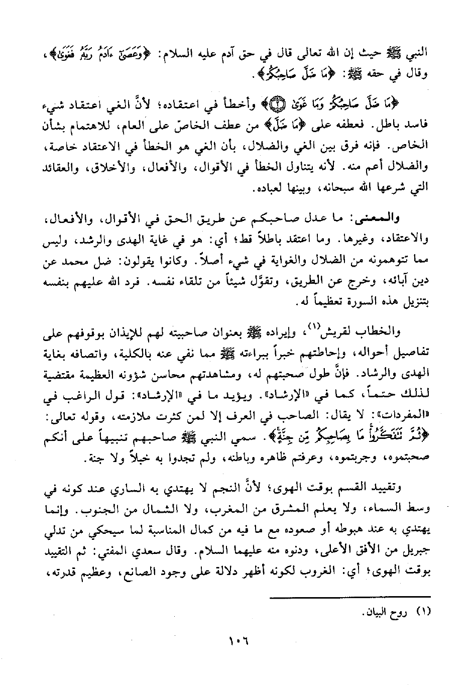 {مَا ضَلَّ صَاحِبُكُمْ وَمَا غَوَى (2)} وأخطأ في اعتقاده؛ لأنَّ الغي اعتقاد شيء فاسد باطل. فعطفه على {مَا ضَلَّ} من عطف الخاصّ على العام، للاهتمام بشأن الخاص. فإنه فرق بين الغي والضلال، بأن الغي هو الخطأ في الاعتقاد خاصة، والضلال أعم منه. لأنه يتناول الخطأ في الأقوال، والأفعال، والأخلاق، والعقائد التي شرعها الله سبحانه، وبينها لعباده.