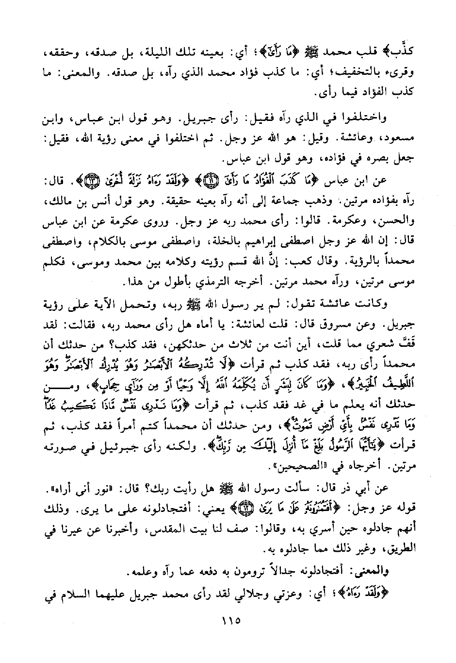 عن ابن عباس {مَا كَذَبَ الْفُؤَادُ مَا رَأَى (11)} {وَلَقَدْ رَآهُ نَزْلَةً أُخْرَى (13)}. قال: رآه بفؤاده مرتين. وذهب جماعة إلى أنه رآه بعينه حقيقة. وهو قول أنس بن مالك، والحسن، وعكرمة. قالوا: رأى محمد ربه عز وجل. وروى عكرمة عن ابن عباس قال: إن الله عز وجل اصطفى إبراهيم بالخلة، واصطفى موسى بالكلام، واصطفى محمدًا بالرؤية. وقال كعب: إنَّ الله قسم رؤيته وكلامه بين محمد وموسى، فكلم موسى مرتين، ورآه محمد مرتين. أخرجه الترمذي بأطول من هذا.