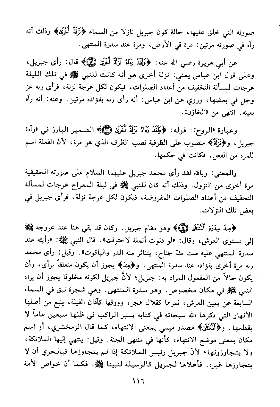 عن أبي هريرة رضي الله عنه: {وَلَقَدْ رَآهُ نَزْلَةً أُخْرَى (13)} قال: رأى جبريل، وعلى قول ابن عباس يعني: نزلة أخرى هو أنه كانت للنبي - صلى الله عليه وسلم - في تلك الليلة عرجات لمسألة التخفيف من أعداد الصلوات، فيكون لكل عرجة نزلة، فرأى ربه عز وجل في بعضها، وروي عن ابن عباس: أنه رأى ربه بفؤاده مرتين. وعنه: أنه رآه بعينه. انتهى من "الخازن".