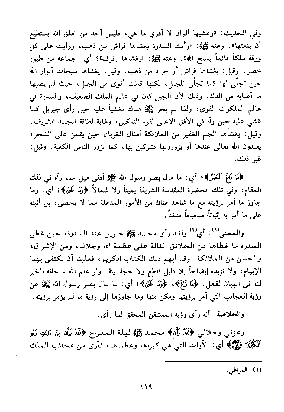 17 - {مَا زَاغَ الْبَصَرُ}؛ أي: ما مال بصر رسول الله - صلى الله عليه وسلم - أدنى ميل عما رآه في ذلك المقام، وفي تلك الحضرة المقدسة الشريفة يمينًا ولا شمالًا {وَمَا طَغَى}؛ أي: وما جاوز ما أمر برؤيته مع ما شاهد هناك من الأمور المذهلة مما لا يحصى، بل أثبته على ما أمر به إثباتًا صحيحًا متيقنًا.