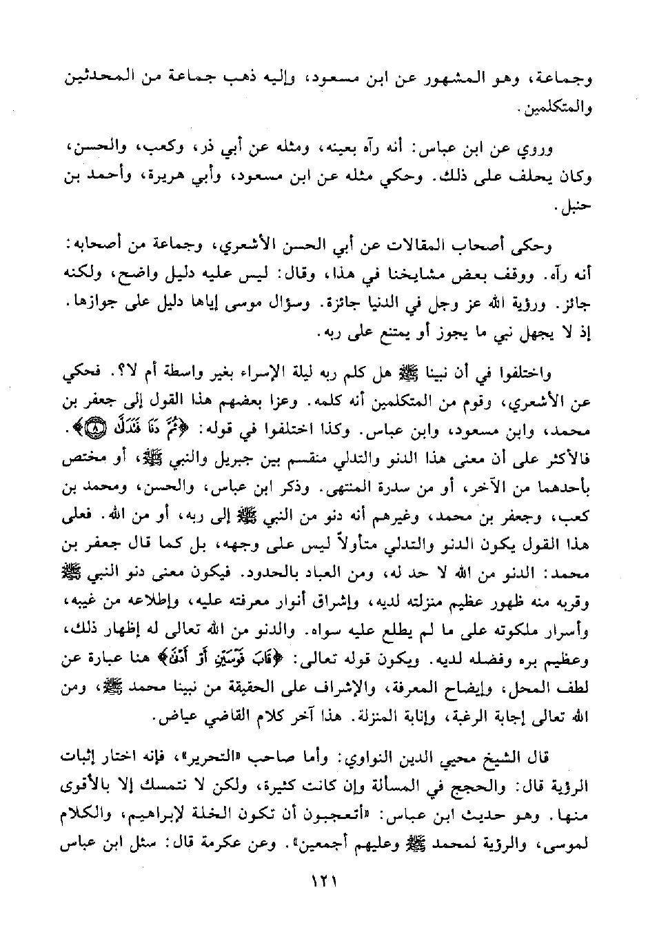 قال الشيخ محيي الدين النواوي: وأما صاحب "التحرير"، فإنه اختار إثبات الرؤية قال: والحجج في المسألة وإن كانت كثيرة، ولكن لا نتمسك إلا بالأقوى منها. وهو حديث ابن عباس: "أتعجبون أن تكون الخلة لإبراهيم، والكلام لموسى، والرؤية لمحمد - صلى الله عليه وسلم - وعليهم أجمعين". وعن عكرمة قال: سئل ابن عباس