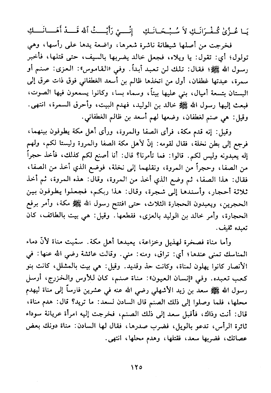 فخرجت من أصلها شيطانة ناشرة شعرها، واضعة يدها على رأسها، وهي تولول؛ أي: تقول: يا ويلاه، فجعل خالد يضربها بالسيف، حتى قتلها، فأخبر رسول الله - صلى الله عليه وسلم -؛ فقال: تلك لن تعبد أبدًا. وفي "القاموس": العزى: صنم أو سمرة، عبدتها غطفان، أول من اتخذها ظالم بن أسعد الغطفاني فوق ذات عرق إلى البستان بتسعة أميال، بني عليها بيتًا، وسماه بسا، وكانوا يسمعون فيها الصوت، فبعث إليها رسول الله - صلى الله عليه وسلم - خالد بن الوليد، فهدم البيت، وأحرق السمرة، انتهى. وقيل: هي صنم لغطفان، وضعها لهم أسعد بن ظالم الغطفاني.