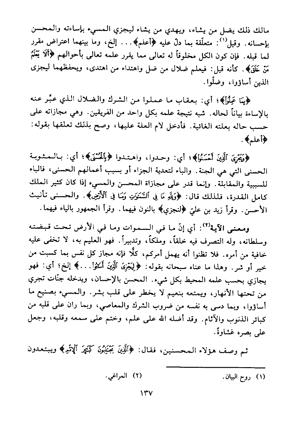 ومعنى الآية (¬2): أي إنّ ما في السموات وما في الأرض تحت قبضته وسلطانه، وله التصرف فيه خلقًا، وملكًا، وتدبيرًا. فهو العليم به، لا تخفى عليه خافية من أمره. فلا تظنوا أنه يهمل أمركم، كلًّا فإنه مجار كل نفس بما كسبت من خير أو شر. وهذا ما عناه سبحانه بقوله: {لِيَجْزِيَ الَّذِينَ أَسَاءُوا ...} إلخ؛ أي: فهو يجازي بحسب علمه المحيط بكل شيء. المحسن بالإحسان" ويدخله جنّات تجري من تحتها الأنهار، ويمتعه بنعيم لا يخطر على قلب بشر. والمسيء بصنيع ما أساؤوا، وبما دسى به نفسه من ضروب الشرك والمعاصي، وبما ران على قلبه من كبائر الذنوب والآثام. وقد أصله الله على علم، وختم على سمعه وقلبه، وجعل على بصره غشاوةً.