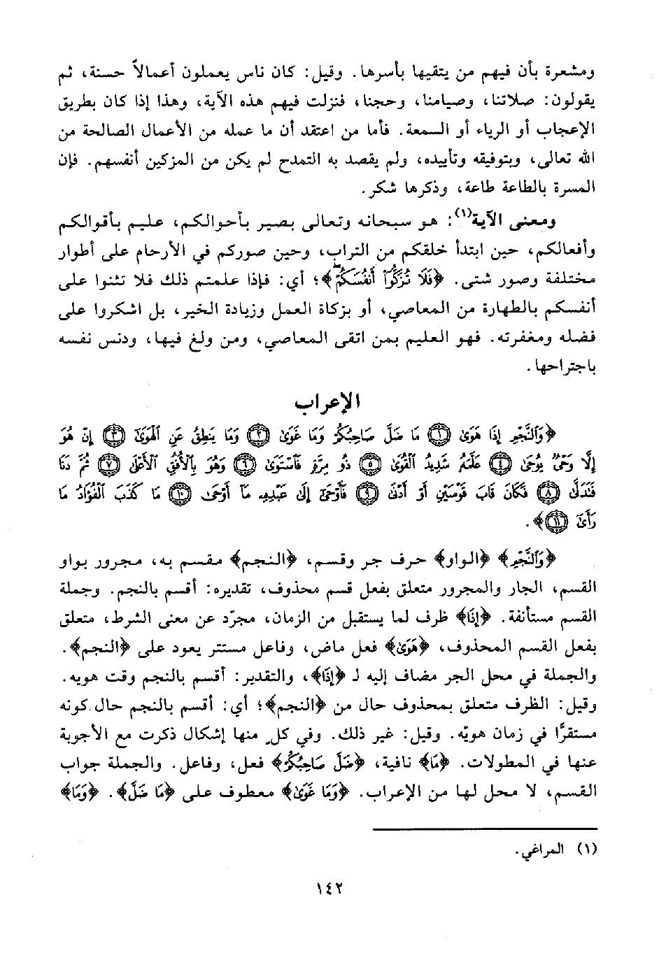 {وَالنَّجْمِ} {الواو} حرف جر وقسم، {النجم} مقسم به، مجرور بواو القسم، الجار والمجرور متعلق بفعل قسم محذوف، تقديره: أقسم بالنجم. وجملة القسم مستأنفة. {إِذَا} ظرف لما يستقبل من الزمان، مجرّد عن معنى الشرط، متعلق بفعل القسم المحذوف، {هَوَى} فعل ماض، وفاعل مستتر يعود على {النجم}. والجملة في محل الجر مضاف إليه لـ {إِذَا}، والتقدير: أقسم بالنجم وقت هويه. وقيل: الظرف متعلق بمحذوف حال من {النجم}؛ أي: أقسم بالنجم حال كونه مستقرًّا في زمان هويّه. وقيل: غير ذلك. وفي كلٍ منها إشكال ذكرت مع الأجوبة عنها في المطولات. {مَا} نافية، {ضَلَّ صَاحِبُكُمْ} فعل، وفاعل. والجملة جواب القسم، لا محل لها من الإعراب. {وَمَا غَوَى} معطوف على {مَا ضَلَّ}. {وَمَا}