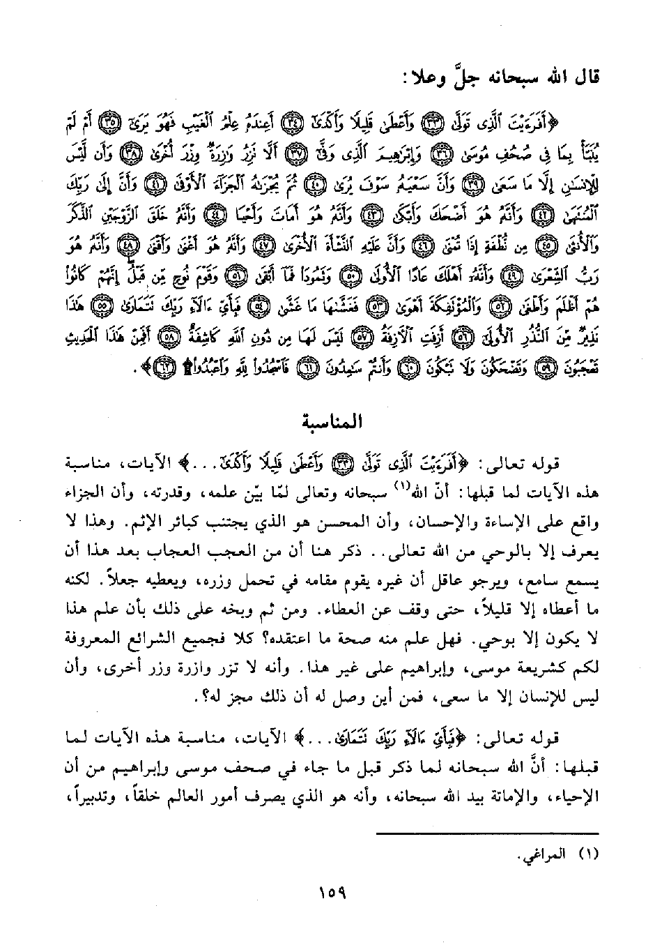 {أَفَرَأَيْتَ الَّذِي تَوَلَّى (33) وَأَعْطَى قَلِيلًا وَأَكْدَى (34) أَعِنْدَهُ عِلْمُ الْغَيْبِ فَهُوَ يَرَى (35) أَمْ لَمْ يُنَبَّأْ بِمَا فِي صُحُفِ مُوسَى (36) وَإِبْرَاهِيمَ الَّذِي وَفَّى (37) أَلَّا تَزِرُ وَازِرَةٌ وِزْرَ أُخْرَى (38) وَأَنْ لَيْسَ لِلْإِنْسَانِ إِلَّا مَا سَعَى (39) وَأَنَّ سَعْيَهُ سَوْفَ يُرَى (40) ثُمَّ يُجْزَاهُ الْجَزَاءَ الْأَوْفَى (41) وَأَنَّ إِلَى رَبِّكَ الْمُنْتَهَى (42) وَأَنَّهُ هُوَ أَضْحَكَ وَأَبْكَى (43) وَأَنَّهُ هُوَ أَمَاتَ وَأَحْيَا (44) وَأَنَّهُ خَلَقَ الزَّوْجَيْنِ الذَّكَرَ وَالْأُنْثَى (45) مِنْ نُطْفَةٍ إِذَا تُمْنَى (46) وَأَنَّ عَلَيْهِ النَّشْأَةَ الْأُخْرَى (47) وَأَنَّهُ هُوَ أَغْنَى وَأَقْنَى (48) وَأَنَّهُ هُوَ رَبُّ الشِّعْرَى (49) وَأَنَّهُ أَهْلَكَ عَادًا الْأُولَى (50) وَثَمُودَ فَمَا أَبْقَى (51) وَقَوْمَ نُوحٍ مِنْ قَبْلُ إِنَّهُمْ كَانُوا هُمْ أَظْلَمَ وَأَطْغَى (52) وَالْمُؤْتَفِكَةَ أَهْوَى (53) فَغَشَّاهَا مَا غَشَّى (54) فَبِأَيِّ آلَاءِ رَبِّكَ تَتَمَارَى (55) هَذَا نَذِيرٌ مِنَ النُّذُرِ الْأُولَى (56) أَزِفَتِ الْآزِفَةُ (57) لَيْسَ لَهَا مِنْ دُونِ اللَّهِ كَاشِفَةٌ (58) أَفَمِنْ هَذَا الْحَدِيثِ تَعْجَبُونَ (59) وَتَضْحَكُونَ وَلَا تَبْكُونَ (60) وَأَنْتُمْ سَامِدُونَ (61) فَاسْجُدُوا لِلَّهِ وَاعْبُدُوا (62)}.
