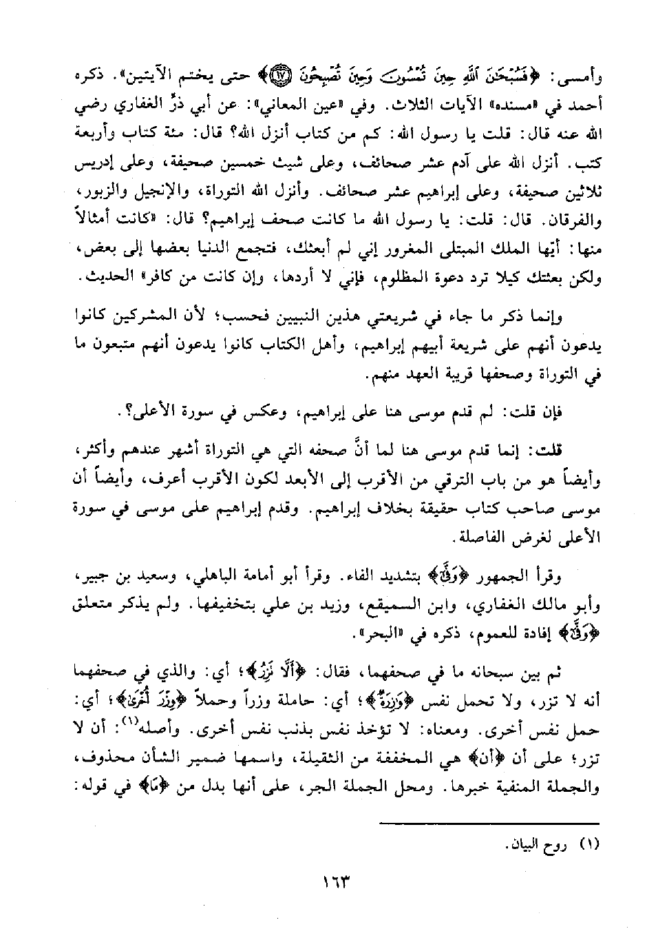 قلت: إنما قدم موسى هنا لما أنَّ صحفه التي هي التوراة أشهر عندهم وأكثر، وأيضًا هو من باب الترقي من الأقرب إلى الأبعد لكون الأقرب أعرف، وأيضًا أن موسى صاحب كتاب حقيقة بخلاف إبراهيم. وقدم إبراهيم على موسى في سورة الأعلى لغرض الفاصلة.