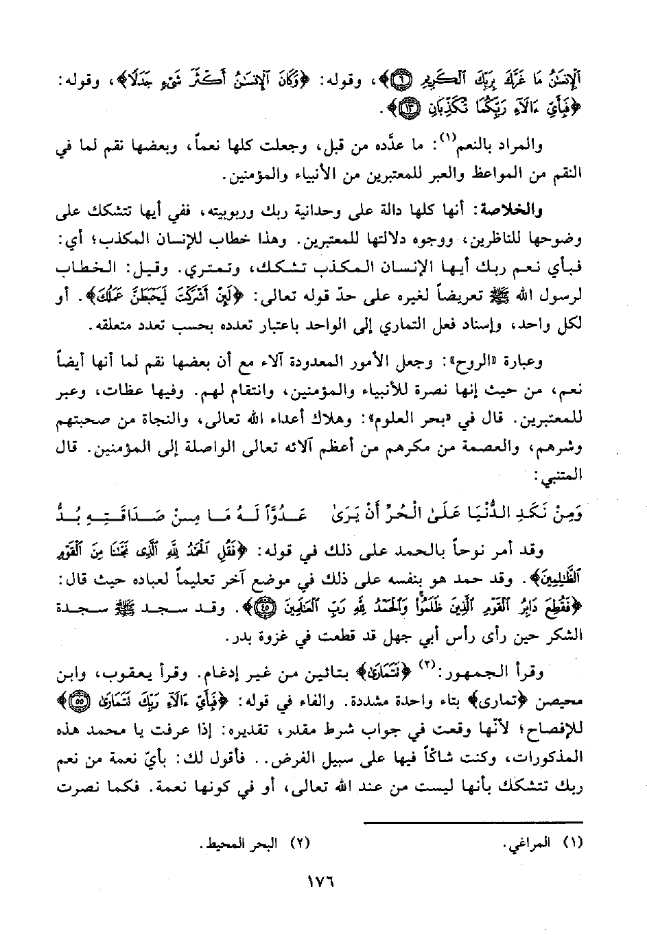 وعبارة "الروح": وجعل الأمور المعدودة الطاء مع أن بعضها نقم لما أنها أيضًا نعم، من حيث إنها نصرة للأنبياء والمؤمنين، وانتقام لهم. وفيها عظات، وعبر للمعتبرين. قال في "بحر العلوم": وهلاك أعداء الله تعالى؛ والنجاة من صحبتهم وشرهم، والعصمة من مكرهم من أعظم آلاته تعالى الواصلة إلى المؤمنين. قال المتنبي: