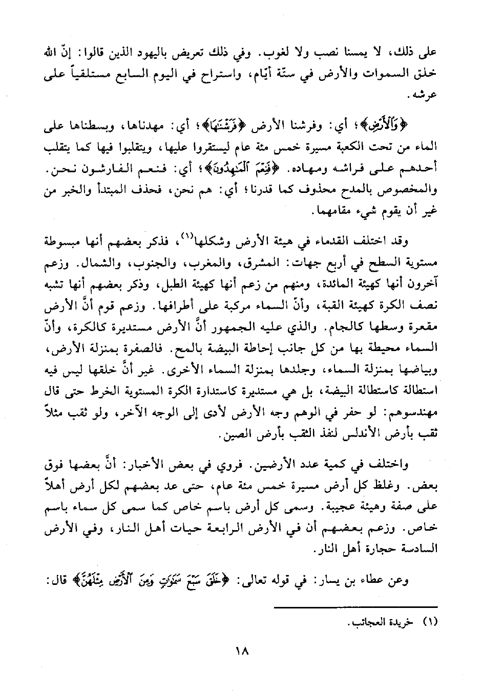 وقد اختلف القدماء في هيئة الأرض وشكلها (¬1)، فذكر بعضهم أنها مبسوطة مستوية السطح في أربع جهات: المشرق، والمغرب، والجنوب، والشمال. وزعم آخرون أنها كهيئة المائدة، ومنهم من زعم أنها كهيئة الطبل، وذكر بعضهم أنها تشبه نصف الكرة كهيئة القبة، وأنّ السماء مركبة على أطرافها. وزعم قوم أن الأرض مقعرة وسطها كالجام. والذي عليه الجمهور أنَّ الأرض مستديرة كالكرة، وأنّ السماء محيطة بها من كل جانب إحاطة البيضة بالمح. فالصفرة بمنزلة الأرض، وبياضها بمنزلة السماء، وجلدها بمنزلة السماء الأخرى. غير أنَّ خلقها ليس فيه استطالة كاستطالة البيضة، بل هي مستديرة كاستدارة الكرة المستوية الخرط حتى قال مهندسوهم: لو حفر في الوهم وجه الأرض، لأدى إلى الوجه الآخر، ولو ثقب مثلًا ثقب بأرض الأندلس لنفذ الثقب بأرض الصين.