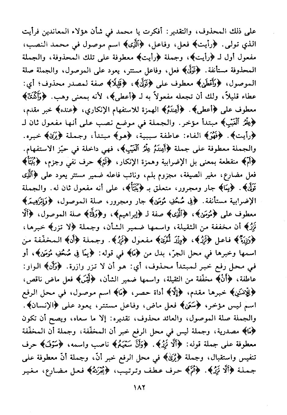 على ذلك المحذوف، والتقدير: أفكرت يا محمد في شأن هؤلاء المعاندين فرأيت الذي تولى. {رأيت} فعل، وفاعل، {الَّذِي} اسم موصول في محمد النصب، مفعول أول لـ {رأيت}، وجملة {رأيت} معطوفة على تلك المحذوفة، والجملة المحذوفة مستأنفة. {تَوَلَّى} فعل، وفاعل مستتر، يعود على الموصول، والجملة صلة الموصول، {وَأَعْطَى} معطوف على {تَوَلَّى}، {قَلِيلًا} صفة لمصدر محذوف؛ أي: عطاء قليلًا, ولك أن تجعله مفعولًا به لـ {أعطى}؛ لأنه بمعنى وهب. {وَأَكْدَى} معطوف على {أعطى}. {أَعِنْدَهُ} الهمزة للاستفهام الإنكاري، {عنده} خبر مقدم، {عِلْمُ الْغَيْبِ} مبتدأ مؤخر. والجملة في موضع نصب على أنها مفعول ثان لي {رأيت}. {فَهُوَ} الفاء: عاطفة سببية، {هو} مبتدأ، وجملة {يَرَى} خبره. والجملة معطوفة على جملة {أَعِنْدَهُ عِلْمُ الْغَيْبِ}، فهي داخلة في حيّز الاستفهام. {أَمْ}، منقطعة بمعنى بل الإضرابية وهمزة الإنكار، {لَمْ} حرف نفي وجزم، {يُنَبَّأْ} فعل مضارع، مغير الصيغة، مجزوم بلم، ونائب فاعله ضمير مستتر يعود على {الَّذِي تَوَلَّى}. {بِمَا} جار ومجرور، متعلق بـ {يُنَبَّأْ}، على أنه مفعول ثان له. والجملة الإضرابية مستأنفة. {في صُحُفِ مُوسَى} جار ومجرور، صلة الموصول، {وَإِبْرَاهِيمَ} معطوف على {مُوسَى}، {الَّذِي} صفة لـ {إبراهيم}، و {وَفَّى} صلة الموصول، {أَلَّا تَزِرُ} أن مخففة من الثقيلة، واسمها ضمير الشأن، وجملة {لا تزر} خبرها, {وَازِرَةٌ} فاعل {تَزِرُ}، {وِزْرَ أُخْرَى} مفعول {تَزِرُ}. وجملة {أن} المخفّفة من اسمها وخبرها في محل الجرّ، بدل من {مَا} في قوله: {بِمَا في صُحُفِ مُوسَى}، أو في محل رفع خبر لمتدأ محذوف، أي: هو أن لا تزر وازرة. {وَأَنْ} الواو: عاطفة، {أَنْ} مخفّفة من الثقيلة، واسمها ضمير الشأن، {لَيْسَ} فعل ماض ناقص، {لِلْإِنْسَانِ} خبرها مقدم، {إِلَّا} أداة حصر، {مَا} اسم موصول، في محل الرفع اسم ليس مؤخر، {سَعَى} فعل ماض، وفاعل مستتر، يعود على {الإنسان}. والجملة صلة الموصول، والعائد محذوف، تقديره: إلا ما سعاه، ويصح أن تكون {مَا} مصدرية، وجملة ليس في محل الرفع خبر أن المخفّفة، وجملة أن المخفّفة معطوفة على جملة قوله: {أَلَّا تَزِرُ}. {وَأَنَّ سَعْيَهُ} ناصب واسمه، {سَوْفَ} حرف تنفيس واستقبال، وجملة {يُرَى} في محل الرفع خبر أنّ، وجملة أنّ معطوفة على جملة {أَلَّا تَزِرُ}. {ثُمَّ} حرف عطف وترتيب، {يُجْزَاهُ} فعل مضارع، مغير