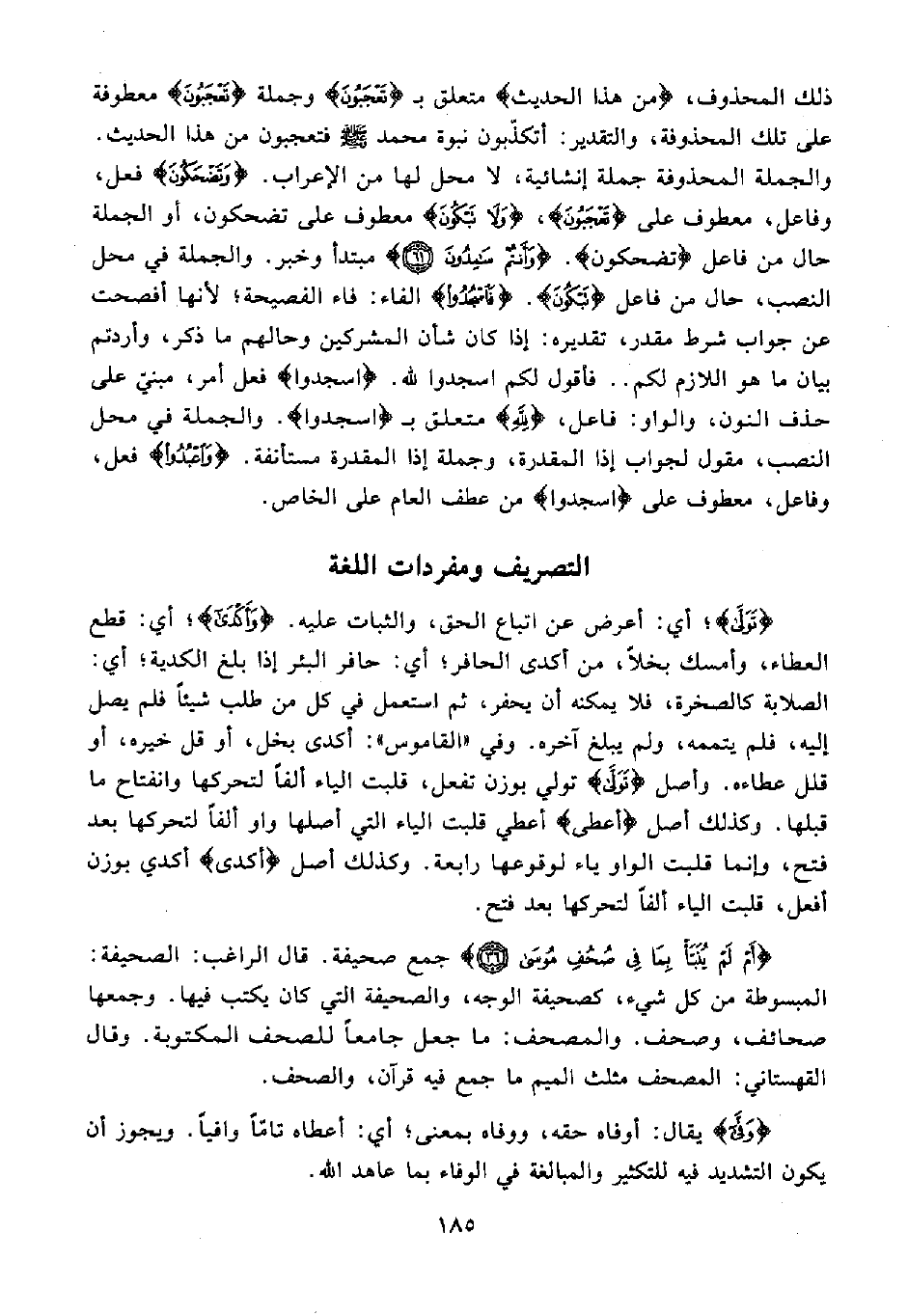 {أَمْ لَمْ يُنَبَّأْ بِمَا فِي صُحُفِ مُوسَى (36)} جمع صحيفة. قال الراغب: الصحيفة: المبسوطة من كل شيء، كصحيفة الوجه، والصحيفة التي كان يكتب فيها. وجمعها صحائف، وصحف. والمصحف: ما جعل جامعًا للصحف المكتوبة. وقال القهستاني: المصحف مثلث الميم ما جمع فيه قرآن، والصحف.