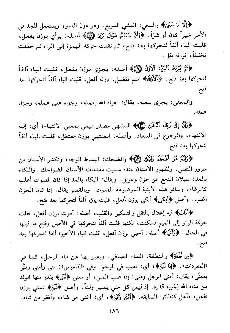 {إِلَّا مَا سَعَى} والسعي: المشي السريع. وهو دون العدو، ويستعمل للجد في الأمر خيرًا كان أو شرًّا. {وَأَنَّ سَعْيَهُ سَوْفَ يُرَى (40)} أصله: يرأي بوزن يفعل، قلبت الياء ألفًا لتحركها بعد فتح، ثم نقلت حركة الهمزة إلى الراء ثم حذفت تخفيفًا، فوزنه يفل.