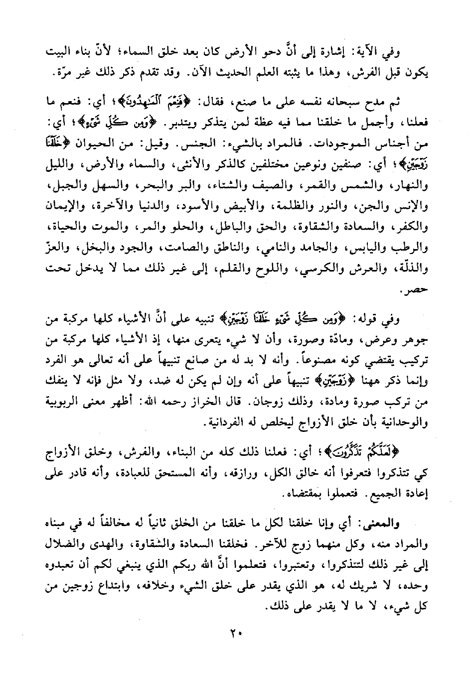 وفي قوله: {وَمِنْ كُلِّ شَيْءٍ خَلَقْنَا زَوْجَيْنِ} تنبيه على أن الأشياء كلها مركبة من جوهر وعرض، ومادّة وصورة، وأن لا شيء يتحرى منها، إذ الأشياء كلها مركبة من تركيب يقتضي كونه مصنوعًا. وأنه لا بد له من صانع تنبيهًا على أنه تعالى هو الفرد وإنما ذكر هاهنا {زَوْجَيْنِ} تنبيهًا على أنه وإن لم يكن له ضد، ولا مثل فإنه لا ينفك من تركب صورة ومادة، وذلك زوجان. قال الخراز رحمه الله: أظهر معنى الربوبية والوحدانية بأن خلق الأزواج ليخلص له الفردانية.