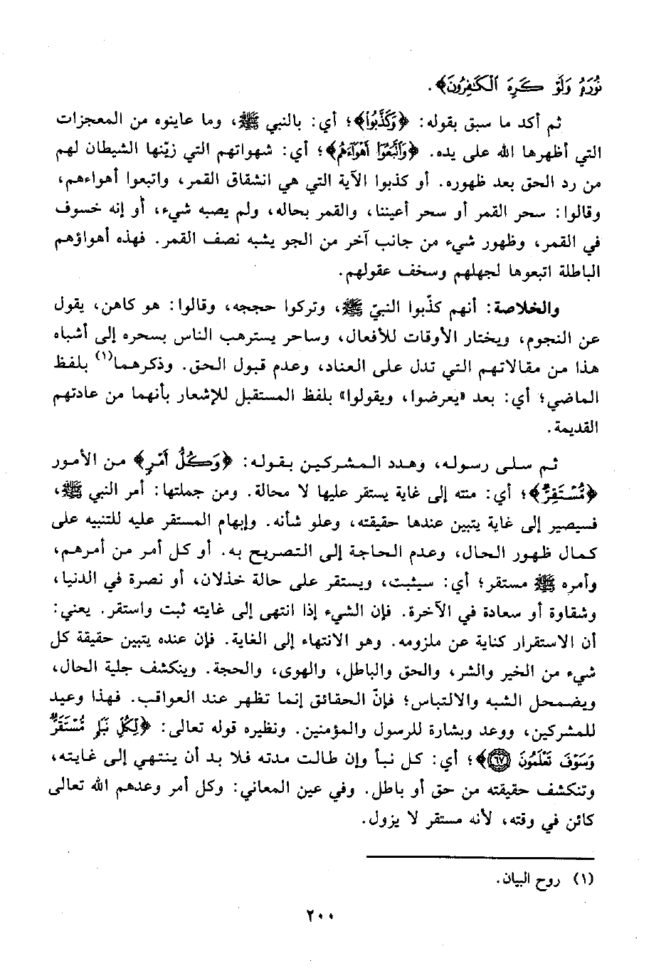 3 - ثم أكد ما سبق بقوله: {وَكَذَّبُوا}؛ أي: بالنبي - صلى الله عليه وسلم -، وما عاينوه من المعجزات التي أظهرها الله على يده. {وَاتَّبَعُوا أَهْوَاءَهُمْ}؛ أي: شهواتهم التي زيّنها الشيطان لهم من رد الحق بعد ظهوره. أو كذبوا الآية التي هي انشقاق القمر، واتبعوا أهواءهم، وقالوا: سحر القمر أو سحر أعيننا، والقمر بحاله، ولم يصبه شيء، أو إنه خسوف في القمر, وظهور شيء من جانب آخر من الجو يشبه نصف القمر. فهذه أهواؤهم الباطلة اتبعوها لجهلهم وسخف عقولهم.