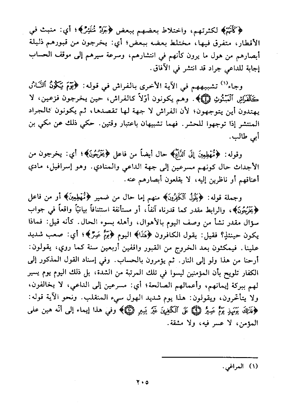 وجاء (¬1) تشبيههم في الآية الأخرى بالفراش في قوله: {يَوْمَ يَكُونُ النَّاسُ كَالْفَرَاشِ الْمَبْثُوثِ (4)}. وهم يكونون أوّلًا كالفراش، حين يخرجون فزعين، لا يهتدون أين يتوجهون؛ لأن الفراش لا جهة لها تقصدها, ثم يكونون كالجراد المنتشر إذا توجهوا للحشر. فهما تشبيهان باعتبار وقتين. حكي ذلك عن مكي بن أبي طالب.