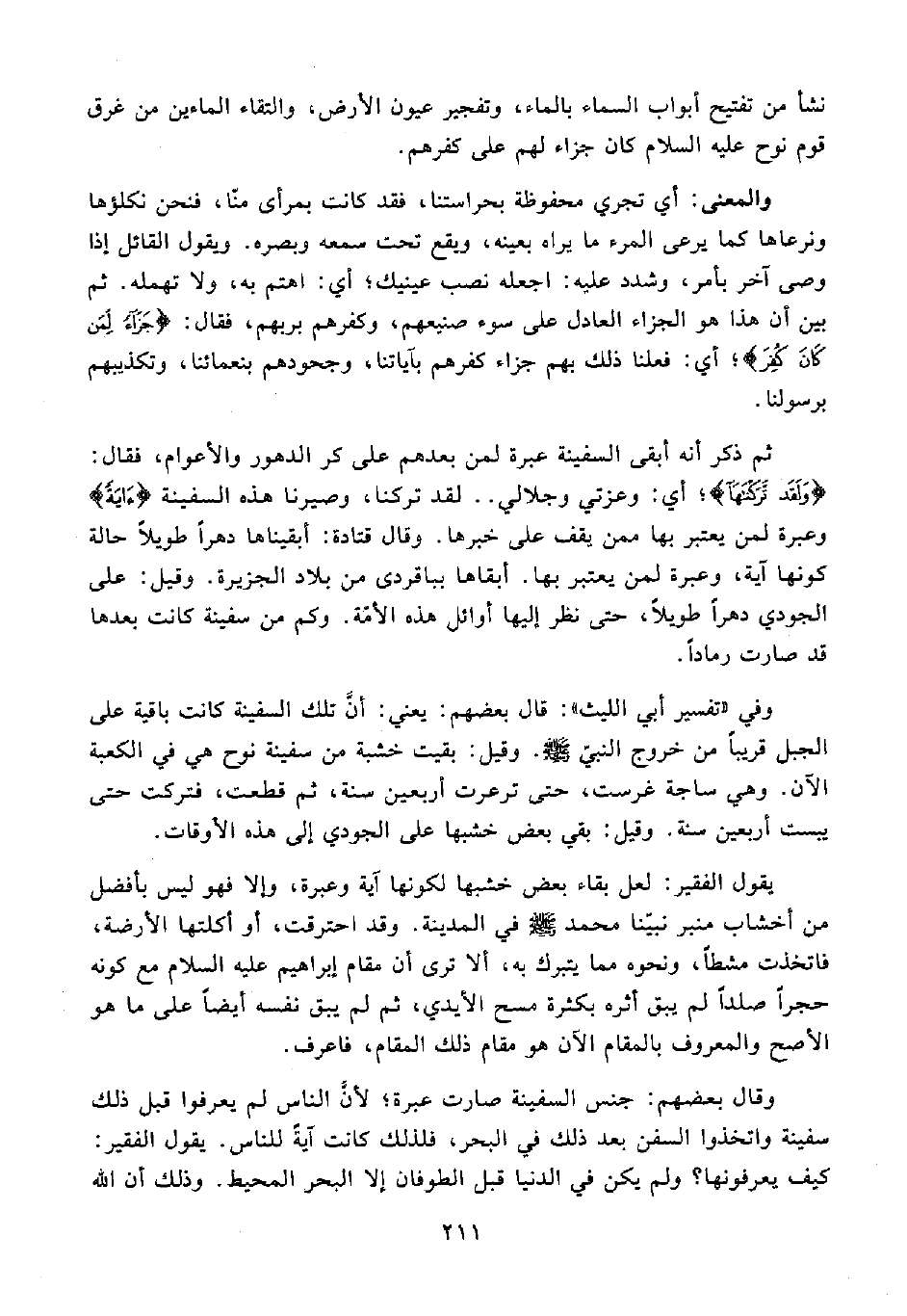 وفي "تفسير أبى الليث": قال بعضهم: يعني: أنَّ تلك السفينة كانت باقية على الجبل قريبًا من خروج النبيّ - صلى الله عليه وسلم -. وقيل: بقيت خشبة من سفينة نوح هي في الكعبة الآن. وهي ساجة غرست، حتى ترعرت أربعين سنة, ثم قطعت، فتركت حتى يبست أربعين سنة. وقيل: بقي بعض خشبها على الجودي إلى هذه الأوقات.