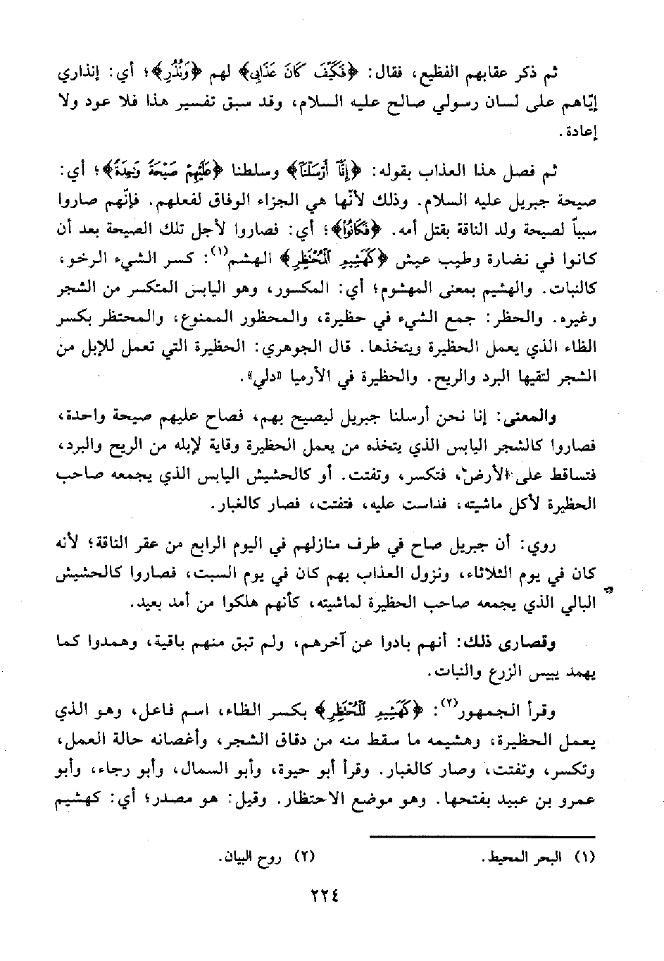 31 - ثم فصل هذا العذاب بقوله: {إِنَّا أَرْسَلْنَا} وسلطنا {عَلَيْهِمْ صَيْحَةً وَاحِدَةً}؛ أي: صيحة جبريل عليه السلام. وذلك لأنّها هي الجزاء الوفاق لفعلهم. فإنّهم صاروا سببًا لصيحة ولد الناقة بقتل أمه. {فَكَانُوا}؛ أي: فصاروا لأجل تلك الصيحة بعد أن كانوا في نضارة وطيب عيش {كَهَشِيمِ الْمُحْتَظِرِ} الهشم (¬1): كسر الشيء الرخو, كالنبات. والهشيم بمعنى المهشوم؛ أي: المكسور، وهو اليابس المتكسر من الشجر وغيره. والحظر: جمع الشيء في حظيرة، والمحظور الممنوع، والمحتظر بكسر الظاء الذي يعمل الحظيرة ويتخذها. قال الجوهري: الحظيرة التي تعمل للإبل من الشجر لتقيها البرد والريح. والحظيرة في الأرميا "دلي".
