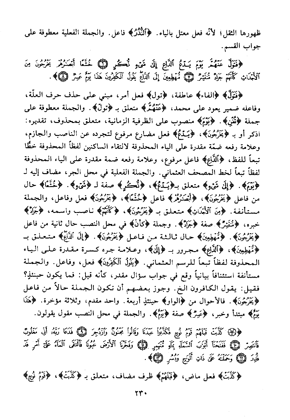 {فَتَوَلَّ} {الفاء} عاطفة، {تَوَلَّ} فعل أمر، مبني على حذف حرف العلّة، وفاعله ضمير يعود على محمد، {عَنْهُمْ} متعلق بـ {تولّ}. والجملة معطوفة على جملة {تُغْنِ}. {يَوْمَ} منصوب على الظرفية الزمانية، متعلق بمحذوف, تقديره: اذكر أو بـ {يَخْرُجُونَ}، {يَدْعُ} فعل مضارع مرفوع لتجرده عن الناصب والجازم، وعلامة رفعه ضمّة مقدرة على الياء المحذوفة لالتقاء الساكنين لفظًا المحذوفة خطًّا تبعًا للفظ، {الدَّاعِ} فاعل مرفوع، وعلامة رفعه ضمة مقدرة على الياء المحذوفة لفظًا تبعًا لخط المصحف العثماني. والجملة الفعلية في محل الجر، مضاف إليه لـ {يَوْمَ}. {إِلَى شَيْءٍ}: متعلق بـ {يَدْعُ}، {نُكُرٍ} صفة لـ {شَيْءٍ}. {خُشَّعًا} حال من فاعل {يَخْرُجُونَ}، {أَبْصَارُهُمْ} فاعل {خُشَّعًا}، {يَخْرُجُونَ} فعل وفاعل، والجملة مستأنفة. {مِنَ الْأَجْدَاثِ} متعلق بـ {يَخْرُجُونَ}، {كَأَنَّهُمْ} ناصب واسمه، {جَرَادٌ} خبره، {مُنْتَشِر} صفة {جَرَادٌ}. وجملة {كَأَنّ} في محل النصب حال ثانية من فاعل {يَخْرُجُونَ}. {مُهْطِعِينَ} حال ثالثة من فاعل {يَخْرُجُونَ}. {إِلَى الدَّاعِ} متعلق بـ {مُهْطِعِينَ}، {الدَّاعِ} مجرور بـ {إِلَى}، وعلامة جره كسرة مقدرة على الياء المحذوفة لفظًا تبعًا للرسم العثماني. {يَقُولُ الْكَافِرُونَ} فعل، وفاعل. والجملة مستأنفة استئنافًا بيانيًا وقع في جواب سؤال مقدر، كأنه قيل: فما يكون حينئذٍ؟ فقيل: يقول الكافرون الخ. وجوز بعضهم أن تكون الجملة حالًا من فاعل {يَخْرُجُونَ}. فالأحوال من {الواو} حينئذٍ أربعة. واحد مقدم، وثلاثة مؤخرة. {هَذَا يَوْمٌ} مبتدأ وخبر، {عَسِرٌ} صفة {يَوْمٌ}. والجملة في محل النصب مقول يقولون.