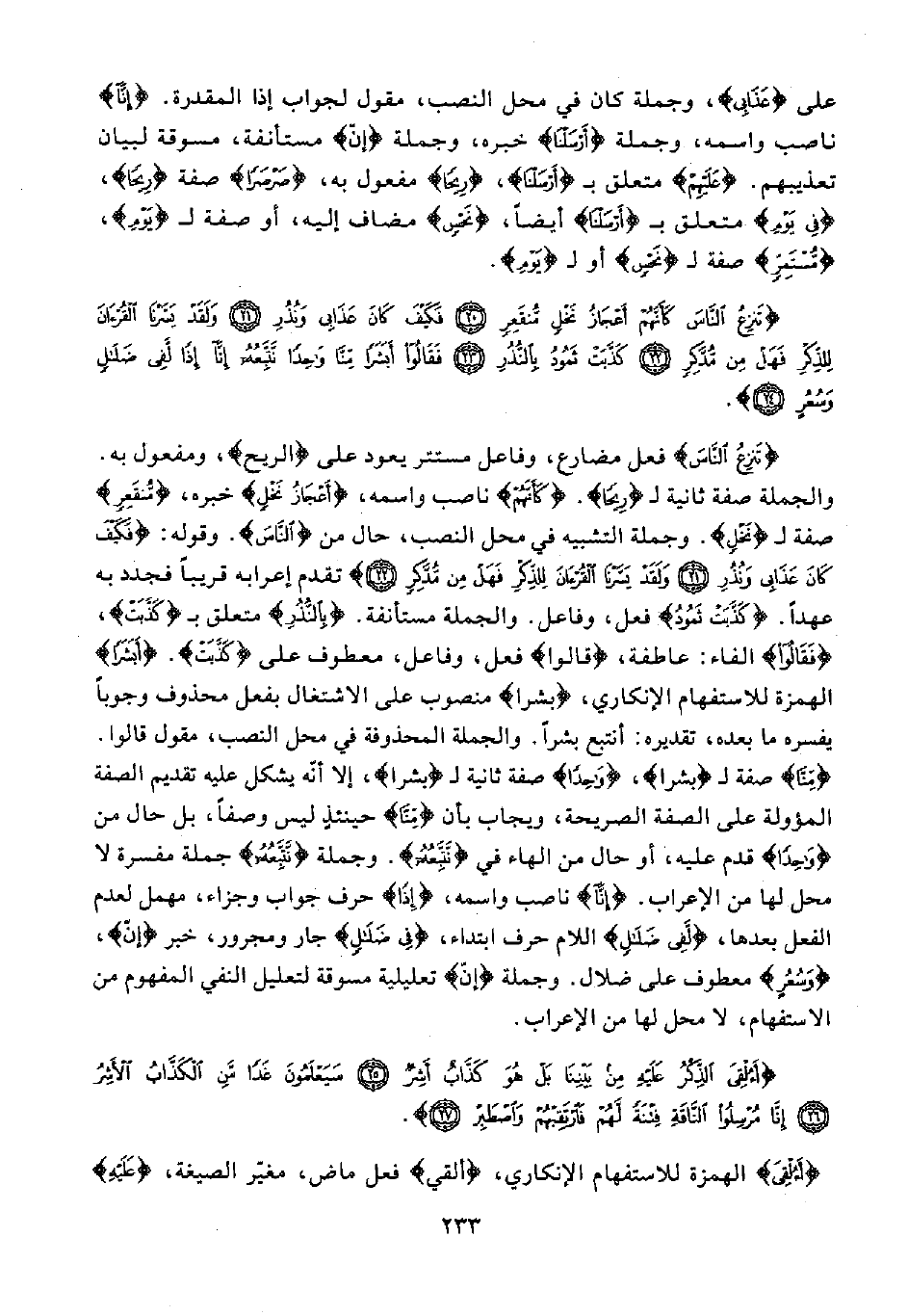 {تَنْزِعُ النَّاسَ} فعل مضارع، وفاعل مستتر يعود على {الريح}، ومفعول به. والجملة صفة ثانية لـ {رِيحًا}. {كَأَنَّهُمْ} ناصب واسمه، {أَعْجَازُ نَخْلٍ} خبره، {مُنْقَعِر} صفة لـ {نَخْلٍ}. وجملة التشبيه في محل النصب، حال من {النَّاسَ}. وقوله: {فَكَيْفَ كَانَ عَذَابِي وَنُذُرِ (21) وَلَقَدْ يَسَّرْنَا الْقُرْآنَ لِلذِّكْرِ فَهَلْ مِنْ مُدَّكِرٍ (22)} تقدم إعرابه قريبًا فجدد به عهدًا. {كَذَّبَتْ ثَمُودُ} فعل، وفاعل. والجملة مستأنفة. {بِالنُّذُرِ} متعلق بـ {كَذَّبَتْ}، {فَقَالُوا} الفاء: عاطفة، {قالوا} فعل، وفاعل، معطوف على {كَذَّبَتْ}. {أَبَشَرًا} الهمزة للاستفهام الإنكاري، {بَشَرًا} منصوب على الاشتغال بفعل محذوف وجوبًا يفسره ما بعده، تقديره: أنتبع بشرًا. والجملة المحذوفة في محل النصب، مقول قالوا. {مِنَّا} صفة لـ {بَشَرًا}، {وَاحِدًا} صفة ثانية لـ {بشرا}، إلا أنّه يشكل عليه نقديم الصفة المؤولة على الصفة الصريحة، ويجاب بأن {مِنَّا} حينئذٍ ليس وصفًا، بل حال من {وَاحِدًا} قدم عليه، أو حال من الهاء في {نَتَّبِعُهُ}. وجملة {نَتَّبِعُهُ} جملة مفسرة لا محل لها من الإعراب. {إِنَّا} ناصب واسمه، {إِذًا} حرف جواب وجزاء، مهمل لعدم الفعل بعدها، {لَفِي ضَلَالٍ} اللام حرف ابتداء، {فِي ضَلَالٍ} جار ومجرور، خبر {إنّ} , {وَسُعُرٍ} معطوف على ضلال. وجملة {إنّ} تعليلية مسوقة لتعليل النفي المفهوم من الاستفهام، لا محل لها من الإعراب.