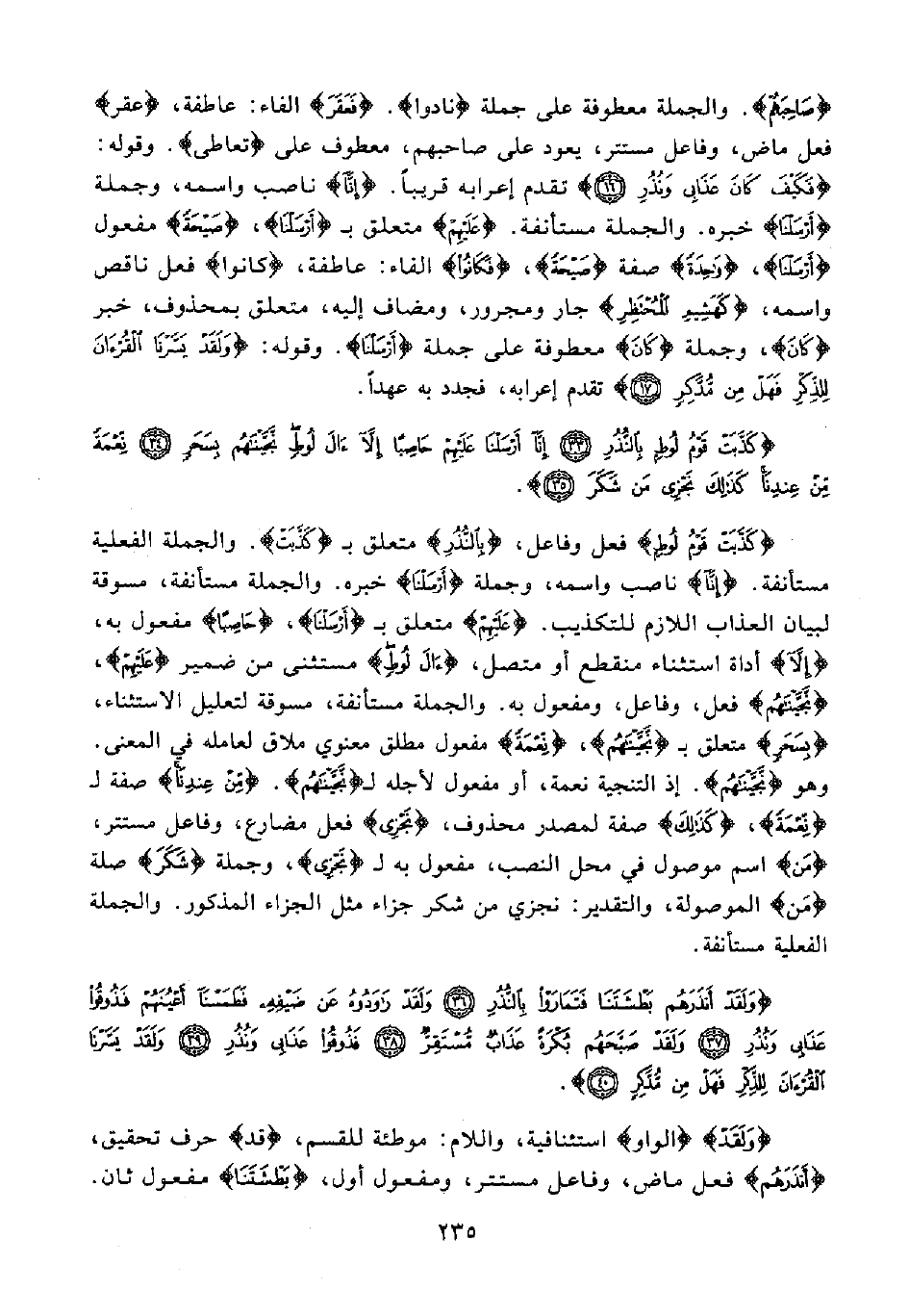 {كَذَّبَتْ قَوْمُ لُوطٍ} فعل وفاعل، {بِالنُّذُرِ} متعلق بـ {كَذَّبَتْ}. والجملة الفعلية مستأنفة. {إِنَّا} ناصب واسمه، وجملة {أَرْسَلْنَا} خبره. والجملة مستأنفة، مسوقة لبيان العذاب اللازم للتكذيب. {عَلَيْهِمْ} متعلق بـ {أَرْسَلْنَا}، {حَاصِبًا} مفعول به، {إِلَّا} أداة استثناء منقطع أو متصل، {آلَ لُوطٍ} مستثنى من ضمير {عَلَيْهِمْ}، {نَجَّيْنَاهُمْ} فعل، وفاعل، ومفعول به. والجملة مستأنفة، مسوقة لعليل الاستثناء، {بِسَحَر} متعلق بـ {نَجَّيْنَاهُمْ}، {نِعْمَةً} مفعول مطلق معنوي ملاق لعامله في المعنى. وهو {نَجَّيْنَاهُمْ}. إذ التنجية نعمة، أو مفعول لأجله لـ {نَجَّيْنَاهُمْ}. {مِنْ عِنْدِنَا} صفة لـ {نِعْمَةً}، {كَذَلِكَ} صفة لمصدر محذوف، {نَجْزِي} فعل مضارع، وفاعل مستتر، {مَن} اسم موصول في محل النصب، مفعول به لـ {نَجْزِي}، وجملة {شَكَر} صلة {مَن} الموصولة، والتقدير: نجزي من شكر جزاء مثل الجزاء المذكور. والجملة الفعلية مستأنفة.