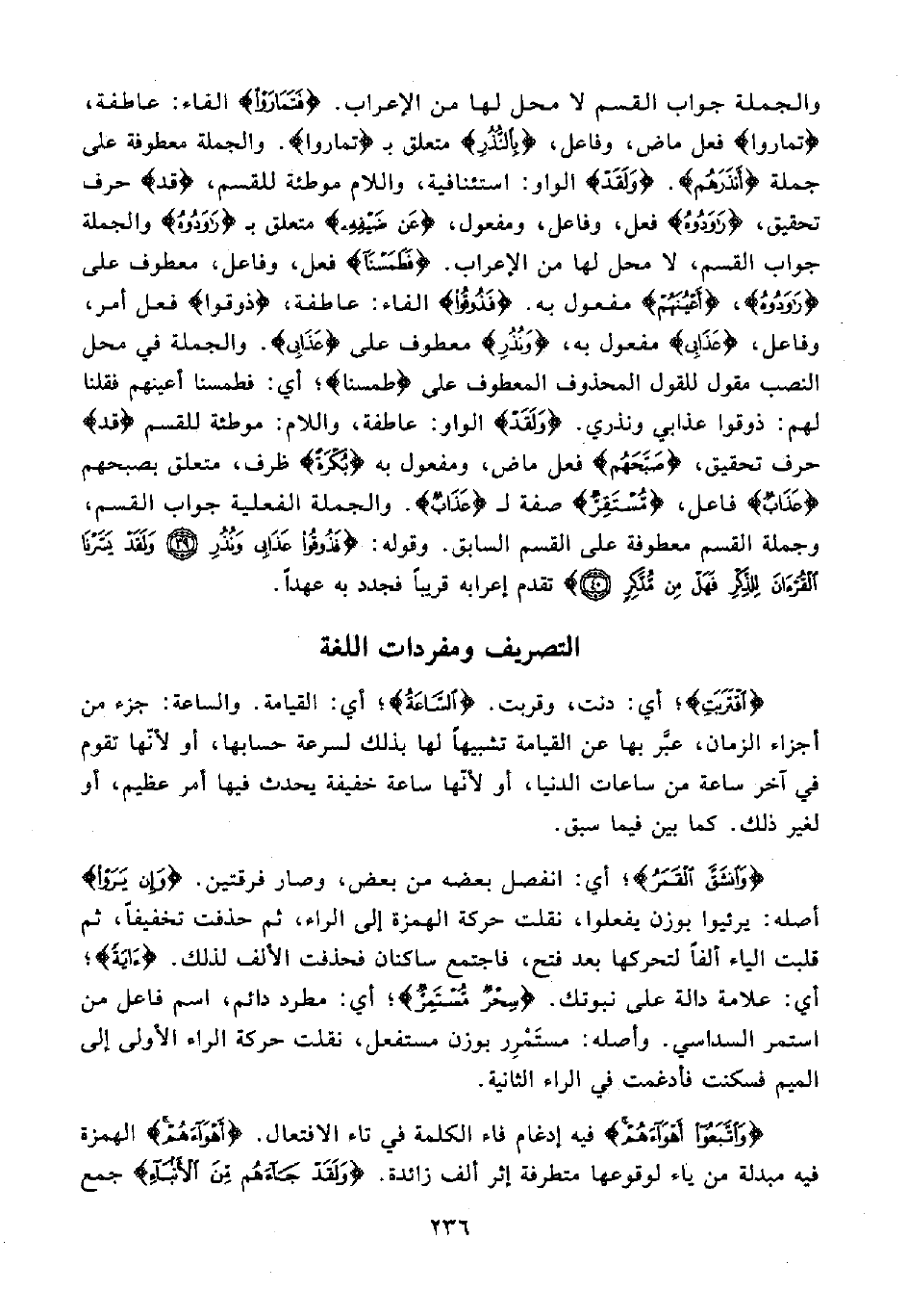 {وَانْشَقَّ الْقَمَرُ}؛ أي: انفصل بعضه من بعض، وصار فرقتين. {وَإِنْ يَرَوْا} أصله: يرئيوا بوزن يفعلوا, نقلت حركة الهمزة إلى الراء، ثم حدفت تخفيفًا، ثم قلبت الياء ألفًا لتحركها بعد فتح، فاجتمع ساكنان فحذفت الألف لذلك. {آيَةً}؛ أي: علامة دالة على نبوتك. {سِحْرٌ مُسْتَمِرٌّ}؛ أي: مطرد دائم، اسم فاعل من استمر السداسي. وأصله: مستَمْرِر بوزن مستفعل، نقلت حركة الراء الأولى إلى الميم فسكنت فأدغمت في الراء الثانية.