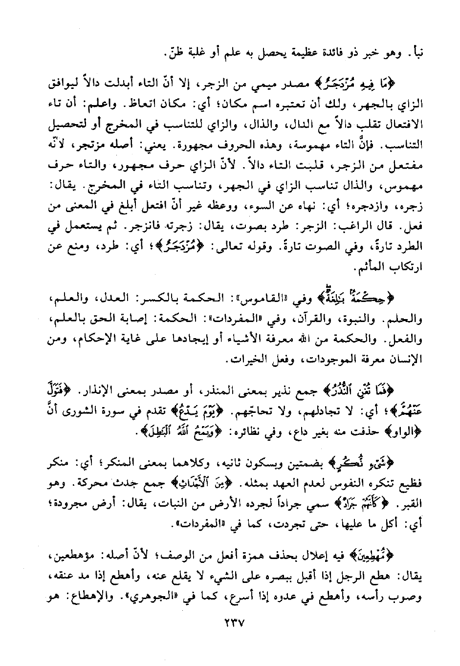 {مَا فِيهِ مُزْدَجَرٌ} مصدر ميمي من الزجر، إلا أن التاء أبدلت دالًا ليوافق الزاي بالجهر، ولك أن تعتبره اسم مكان؛ أي: مكان اتعاظ. واعلم: أن تاء الافتعال تقلب دالًا مع الدال، والذال، والزاي للتناسب في المخرج أو لتحصيل التناسب. فإنَّ التاء مهموسة، وهذه الحروف مجهورة. يعني: أهله مزتجر، لأنّه مفتعل من الزجر, قلبت التاء دالًا. لأنّ الزاي حرف مجهور، والتاء حرف مهموس، والذال تناسب الزاي في الجهر، وتناسب التاء في المخرج. يقال: زجره، وازدجره؛ أي: نهاه عن السوء، ووعظه غير أنّ افتعل أبلغ في المعنى من فعل. قال الراغب: الزجر: طرد بصوت، يقال: زجرته فانزجر. ثم يستعمل في الطرد تارةً، وفي الصوت تارةً. وقوله تعالى: {مُزْدَجَرٌ}؛ أي: طرد، ومنع عن ارتكاب المأثم.