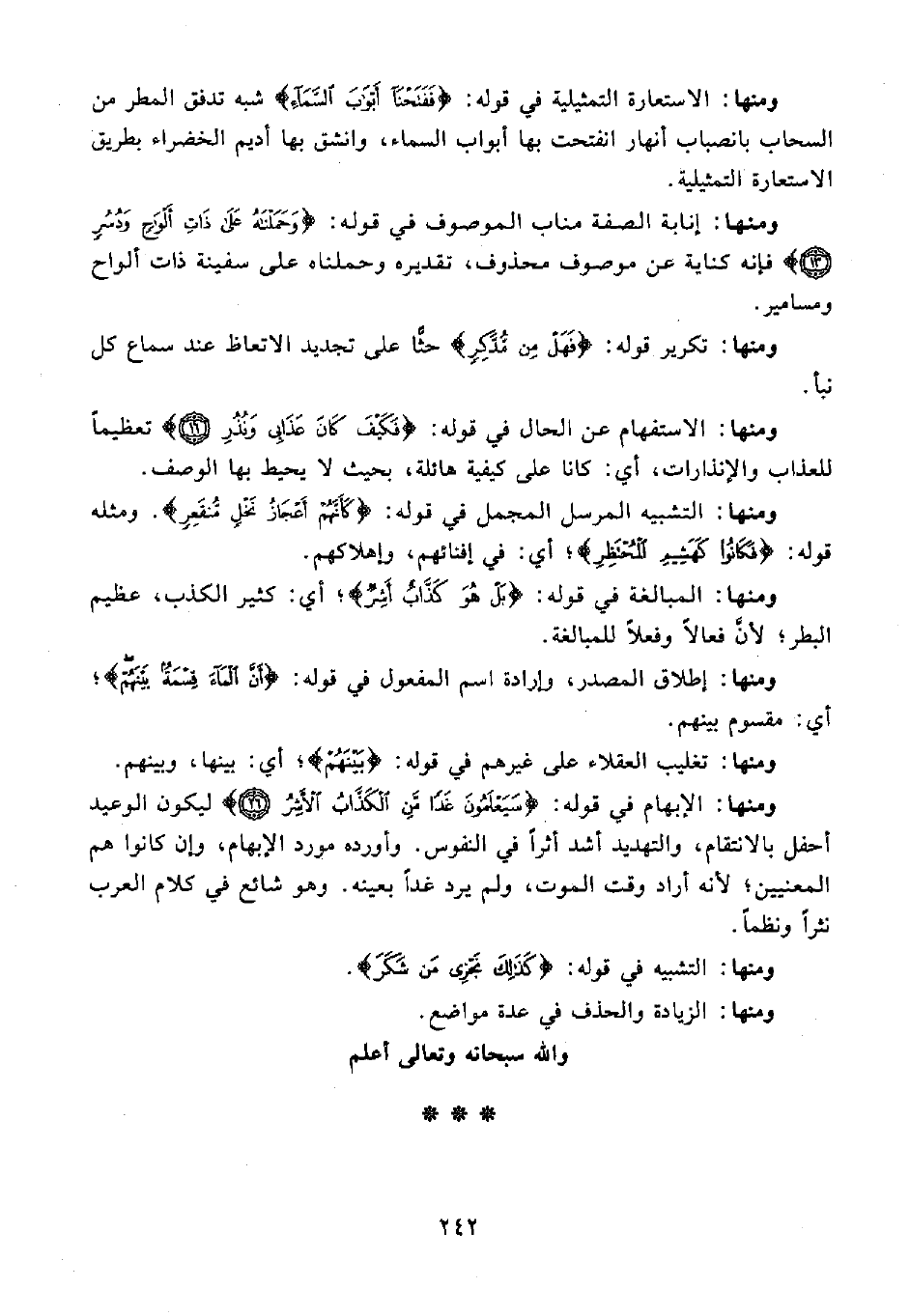 ومنها: التشبيه المرسل المجمل في قوله: {كَأَنَّهُمْ أَعْجَازُ نَخْلٍ مُنْقَعِرٍ}. ومثله قوله: {فَكَانُوا كَهَشِيمِ الْمُحْتَظِرِ}؛ أي: في إفنائهم، وإهلاكهم.