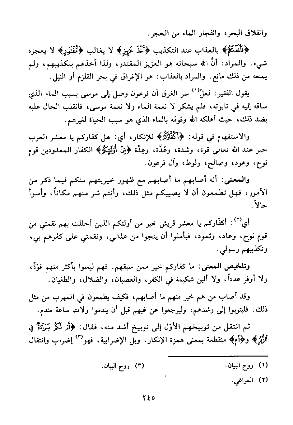 وتلخيص المعنى: ما كفاركم خير ممن سبقهم. فهم ليسوا بأكثر منهم قوّةً، ولا أوفر عددًا، ولا ألين شكيمة في الكفر، والعصيان، والضلال، والطغيان.