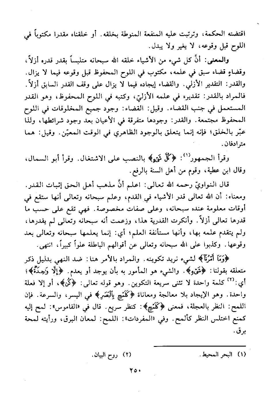 والمعنى: أنَّ كل شيء من الأشياء خلقه الله سبحانه متلبسًا بقدر قدره أزلًا , وقضاءٍ قضاه سبق في علمه، مكتوب في اللوح المحفوظ قبل وقوعه فيما لا يزال. والقدر: التقدير الأزلي. والقضاء إيجاده فيما لا يزال على وقف القدر السابق أزلًا. فالمراد بالقدر: تقديره في علمه الأزليّ، وكتبه في اللوح المحفوظ، وهو القدر المستعمل في جنب القضاء. وقيل: القضاء: وجود جميع المخلوقات في اللوح المحفوظ مجتمعة. والقدر: وجودها متفرقة في الأعيان بعد وجود شرائطها, ولذا عبّر بالخلق؛ فإنه إنما يتعلق بالوجود الظاهري في الوقت المعين. وقيل: هما مترادفان.