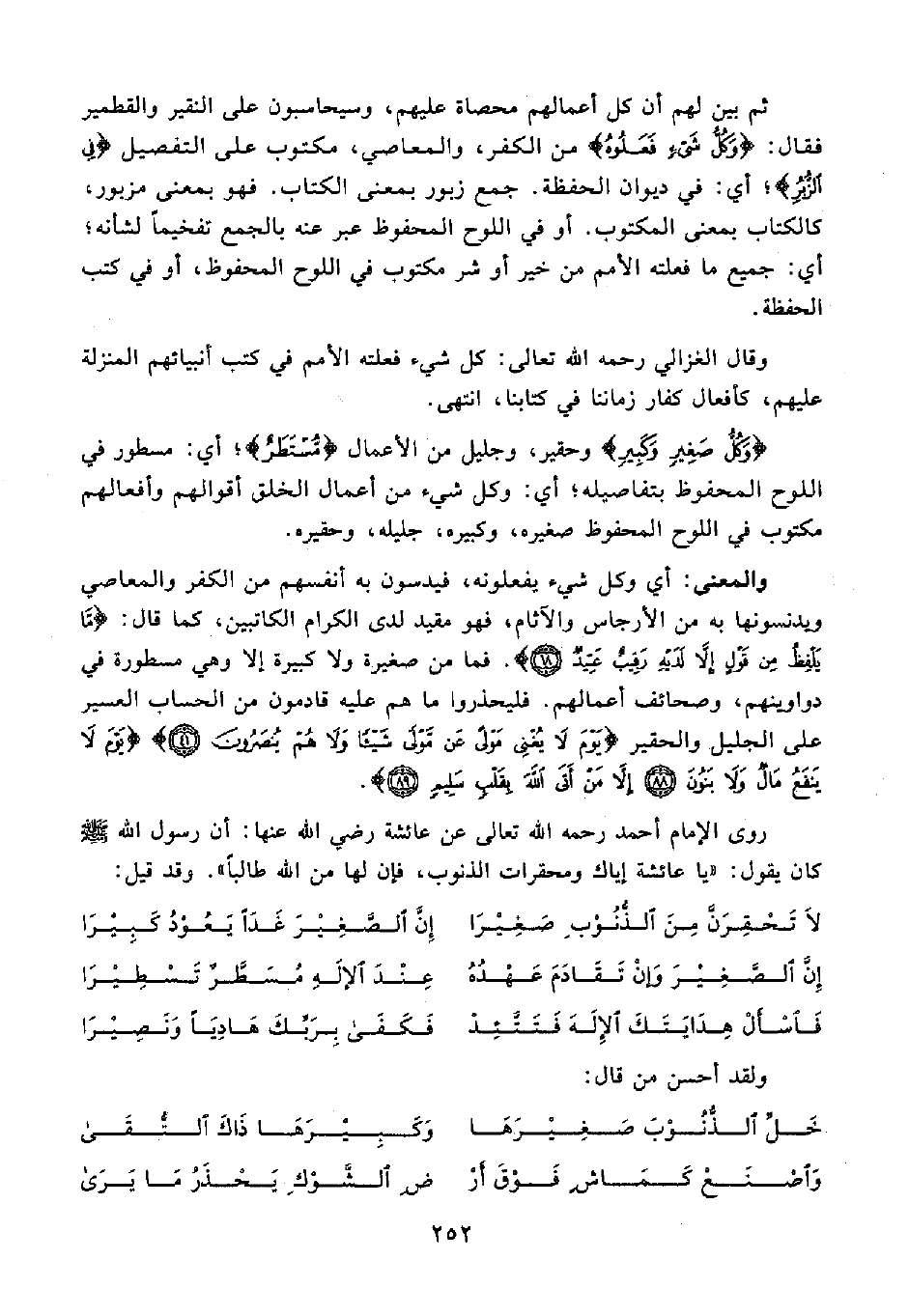 والمعنى: أي وكل شيء يفعلونه، فيدسون به أنفسهم من الكفر والمعاصي ويدنسونها به من الأرجاس والآثام، فهو مقيد لدى الكرام الكاتبين، كما قال: {مَا يَلْفِظُ مِنْ قَوْلٍ إِلَّا لَدَيْهِ رَقِيبٌ عَتِيدٌ (18)}. فما من صغيرة ولا كبيرة إلا وهي مسطورة في دواوينهم، وصحائف أعمالهم. فليحذروا ما هم عليه قادمون من الحساب العسير على الجليل والحقير {يَوْمَ لَا يُغْنِي مَوْلًى عَنْ مَوْلًى شَيْئًا وَلَا هُمْ يُنْصَرُونَ} {يَوْمَ لَا يَنْفَعُ مَالٌ وَلَا بَنُونَ (88) إِلَّا مَنْ أَتَى اللَّهَ بِقَلْبٍ سَلِيمٍ (89)}.