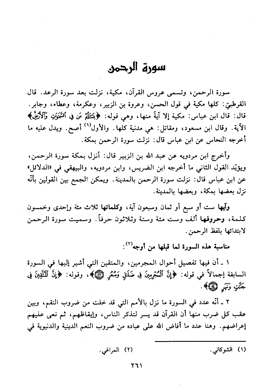 وأخرج ابن مردويه عن عبد الله بن الزبير قال: نزل بمكة سورة الرحمن، ويؤيّد القول الثاني ما أخرجه ابن الضريس، وابن مردويه، والبيهقي في "الدلائل" عن ابن عباس قال: نزلت سورة الرحمن بالمدينة. ويمكن الجمع بين القولين بأنّه نزل بعضها بمكة، وبعضها بالمدينة.