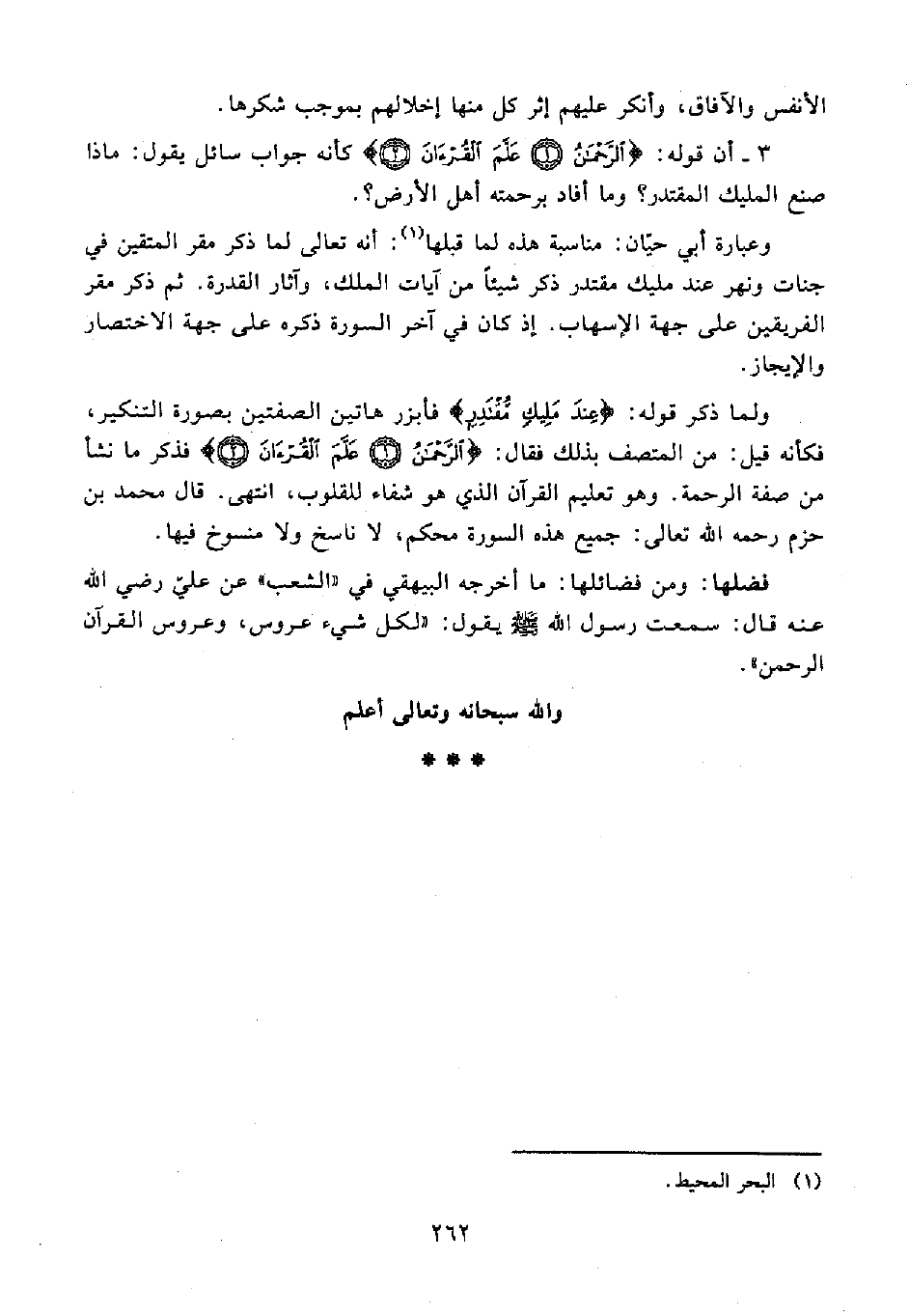 ولما ذكر قوله: {عِنْدَ مَلِيكٍ مُقْتَدِرٍ} فأبرز هاتين الصفتين بصورة التنكير، فكأنه قيل: من المتصف بذلك فقال: {الرَّحْمَنُ (1) عَلَّمَ الْقُرْآنَ (2)} فذكر ما نشأ من صفة الرحمة. وهو تعليم القرآن الذي هو شفاء للقلوب، انتهى. قال محمد بن حزم رحمه الله تعالى: جميع هذه السورة محكم، لا ناسخ ولا منسوخ فيها.