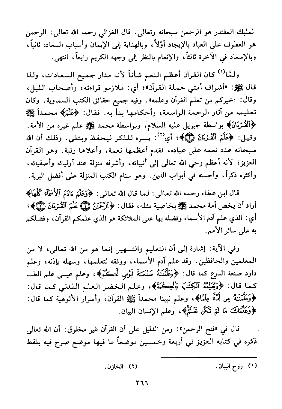 2 - ولمَّا (¬1) كان القرآن أعظم النعم شأنًا لأنه مدار جميع السعادات، ولذا قال - صلى الله عليه وسلم -: "أشراف أمتي حملة القرآن"؛ أي: ملازمو قراءته، وأصحاب الليل، وقال: "خيركم من تعلم القرآن وعلمه". وفيه جميع حقائق الكتب السماوية. وكان تعليمه من آثار الرحمة الواسعة، وأحكامها بدأ به. فقال: {عَلَّمَ} محمدًا - صلى الله عليه وسلم - {الْقُرْآنَ} بواسطة جبريل عليه السلام، وبواسطة محمد - صلى الله عليه وسلم - علم غيره من الأمة. وقيل: {عَلَّمَ الْقُرْآنَ (2)}؛ أي (¬2): يسره للذكر ليحفظ ويتلى. وذلك أن الله سبحانه عدد نعمه على عباده، فقدم أعظمها نعمة، وأعلاها رتبة. وهو القرآن العزيز؛ لأنه أعظم وحي الله تعالى إلى أنبيائه, وأشرفه منزلة عند أوليائه وأصفيائه، وأكثره ذكرًا، وأحسنه في أبواب الدين. وهو سنام الكتب المنزلة على أفضل البرية.