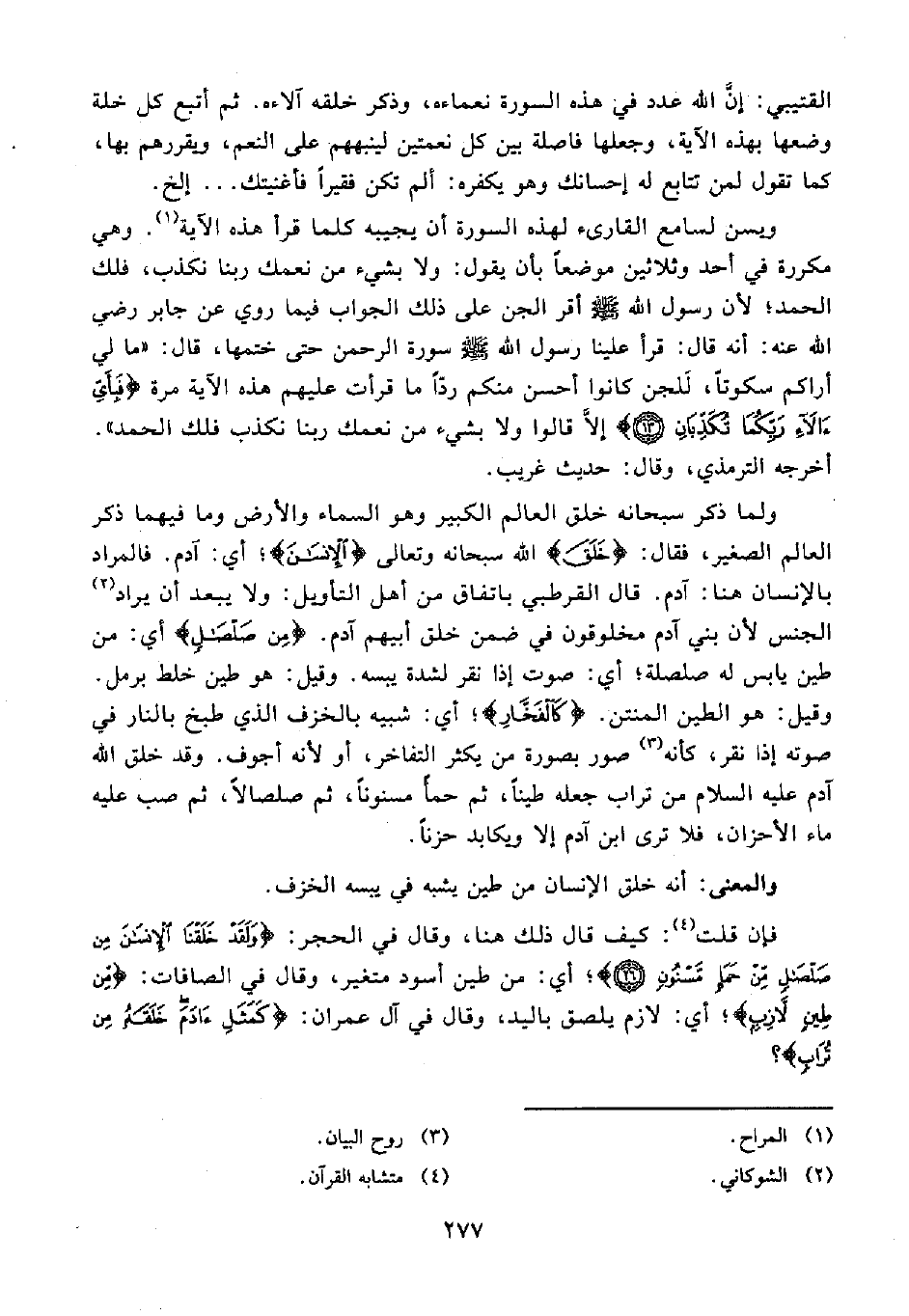 14 - ولما ذكر سبحانه خلق العالم الكبير وهو السماء والأرض وما فيهما ذكر العالم الصغير, فقال: {خَلَقَ} الله سبحانه وتعالى {الْإِنْسَانَ}؛ أي: آدم. فالمراد بالإنسان هنا: آدم. قال القرطبي باتفاق من أهل التأويل: ولا يبعد أن يراد (¬2) الجنس لأن بني آدم مخلوقون في ضمن خلق أبيهم آدم. {مِنْ صَلْصَالٍ} أي: من طين يابس له صلصلة؛ أي: صوت إذا نقر لشدة يبسه. وقيل: هو طين خلط برمل. وقيل: هو الطين المنتن. {كَالْفَخَّارِ}؛ أي: شبيه بالخزف الذي طبخ بالنار في صوته إذا نقر، كأنه (¬3) صور بصورة من يكثر التفاخر، أو لأنه أجوف. وقد خلق الله آدم عليه السلام من تراب جعله طينًا، ثم حمأً مسنونًا، ثم صلصالًا، ثم صب عليه ماء الأحزان، فلا ترى ابن آدم إلا ويكابد حزنًا.