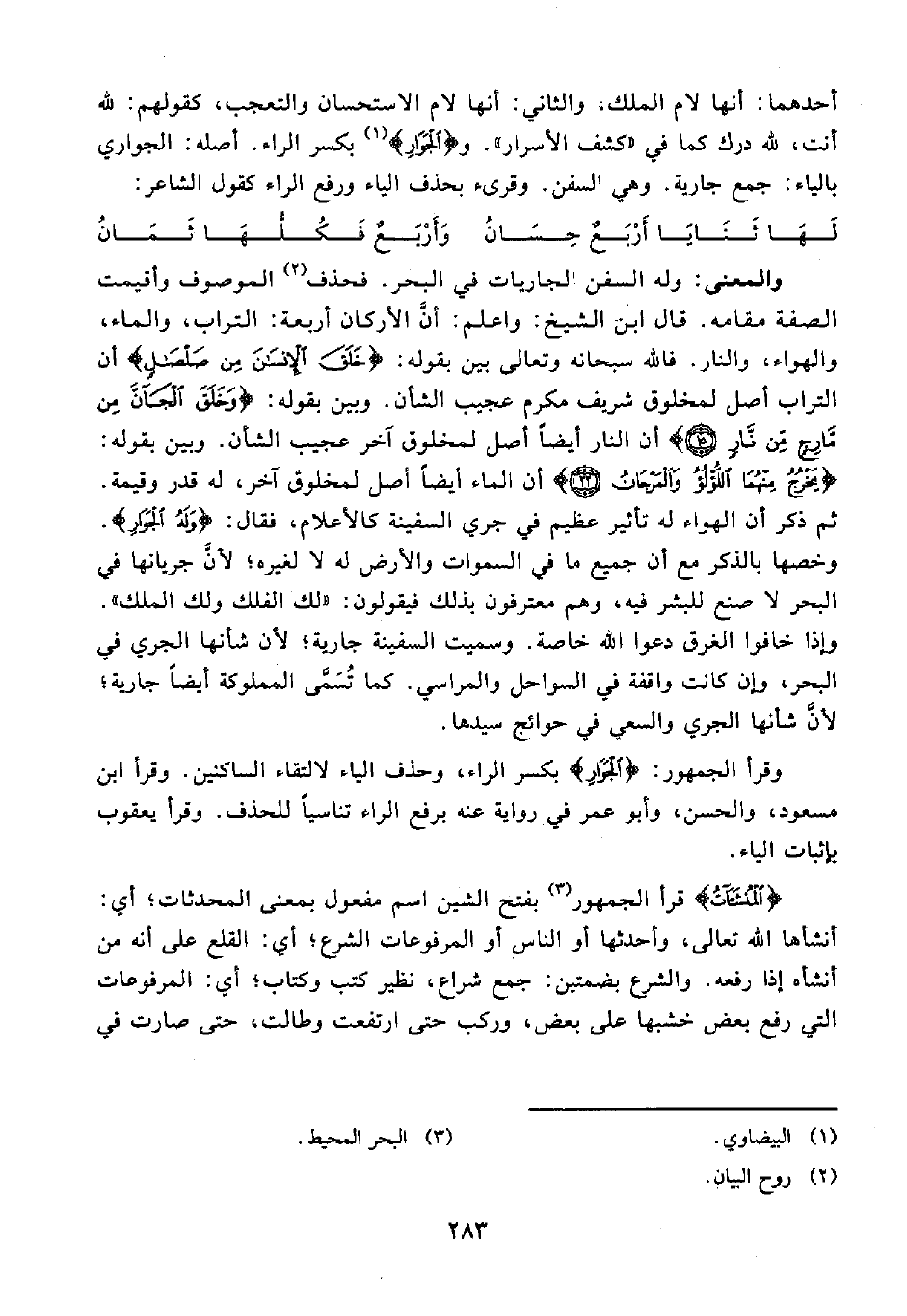 أحدهما: أنها لام الملك، والثاني: أنها لام الاستحسان والتعجب، كقولهم: لله أنت، لله درك كما في "كشف الأسرار". {الْجَوَارِ} (¬1) بكسر الراء. أصله: الجواري بالياء: جمع جارية. وهي السفن. وقرىء بحذف الياء ورفع الراء كقول الشاعر: