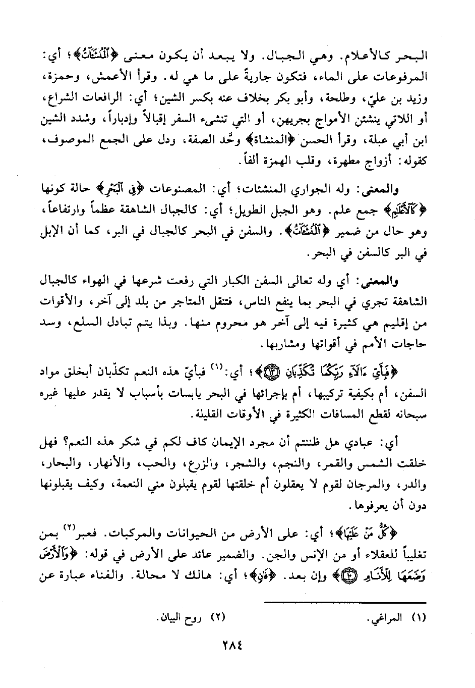 والمعنى: أي وله تعالى السفن الكبار التي رفعت شرعها في الهواء كالجبال الشاهقة تجري في البحر بما ينفع الناس، فتنقل المتاجر من بلد إلى آخر، والأقوات من إقليم هي كثيرة فيه إلى آخر هو محروم منها. وبذا يتم تبادل السلع، وسد حاجات الأمم في أقواتها ومشاربها.