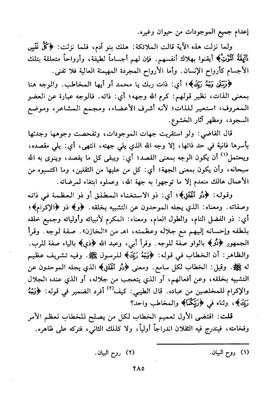 27 - {وَيَبْقَى وَجْهُ رَبِّكَ}؛ أي: ذات ربك يا محمد أو أيها المخاطب. والوجه هنا بمعنى الذات, نظير قولهم: كرم الله وجهه؛ أي: ذاته. فالوجه عبارة عن العضو المعروف، استعير للذات؛ لأنه أشرف الأعضاء، ومجمع المشاعر، وموضع السجود، ومظهر آثار الخشوع.