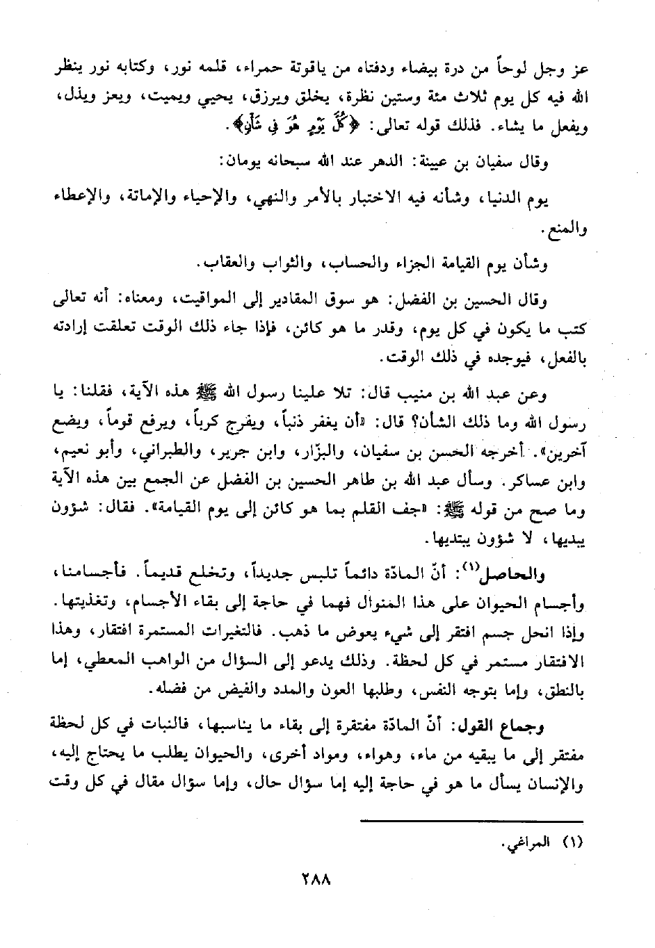 وجماع القول: أنّ المادّة مفتقرة إلى بقاء ما يناسبها، فالنبات في كل لحظة مفتقر إلى ما يبقيه من ماء، وهواء، ومواد أخرى، والحيوان يطلب ما يحتاج إليه، والإنسان يسأل ما هو في حاجة إليه إما سؤال حال، وإما سؤال مقال في كل وقت