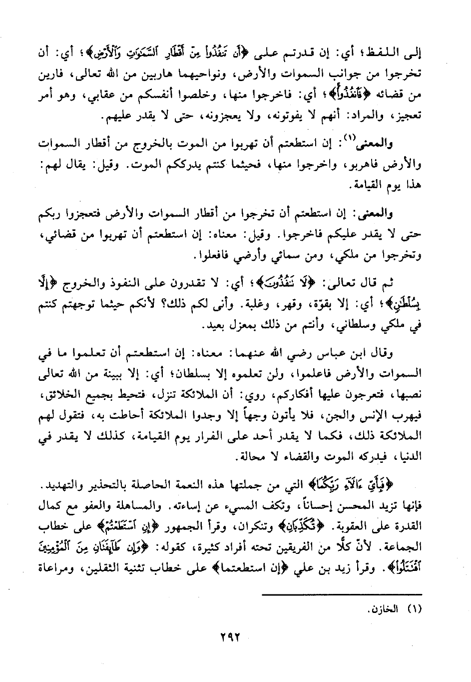 وقال ابن عباس رضي الله عنهما: معناه: إن استطعتم ان تعلموا ما في السموات والأرض فاعلموا, ولن تعلموه إلا بسلطان؛ أي: إلا ببينة من الله تعالى نصبها، فتعرجون عليها أفكاركم، روي: أن الملائكة تنزل، فتحيط بجميع الخلائق، فيهرب الإنس والجن، فلا يأتون وجهًا إلا وجدوا الملائكة أحاطت به، فتقول لهم الملائكة ذلك، فكما لا يقدر أحد على الفرار يوم القيامة، كذلك لا يقدر في الدنيا، فيدركه الموت والقضاء لا محالة.