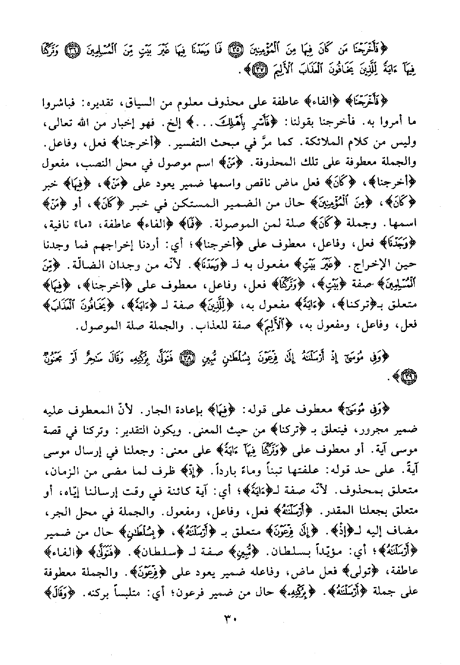 {وَفِي مُوسَى} معطوف على قوله: {فِيِهَا} بإعادة الجار. لأنّ المعطوف عليه ضمير مجرور، فيتعلق بـ {تركنا} من حيث المعنى. ويكون التقدير: وتركنا في قصة موسى آية. أو معطوف على {وَتَرَكْنَا فِيهَا آيَةً} على معنى: وجعلنا في إرسال موسى آيةً. على حد قوله: علقها تبنًا وماءً باردًا. {إِذْ} ظرف لما مضى من الزمان، متعلق بمحذوف. لأنّه صفة لـ {آيَةً}؛ أي: آية كائة في وقت إرسالنا إيّاه، أو متعلق بجعلنا المقدر. {أَرْسَلْنَاهُ} فعل، وفاعل، ومفعول. والجملة في محل الجر، مضاف إليه لـ {إِذْ}. {إِلَى فِرْعَوْنَ} متعلق بـ {أَرْسَلْنَاهُ}، {بِسُلْطَانٍ} حال من ضمير {أَرْسَلْنَاهُ}؛ أي: مؤيدًا بسلطان. {مُبِينٍ} صفة لـ {سُلْطَانٍ}. {فَتَوَلَّى} {الفاء} عاطفة، {تولى} فعل ماض, وفاعله ضمير يعود على {فِرْعَوْنَ}. والجملة معطوفة على جملة {أَرْسَلْنَاهُ}. {بِرُكْنِهِ} حال من ضمير فرعون؛ أي: متلبسًا بركنه. {وَقَالَ}