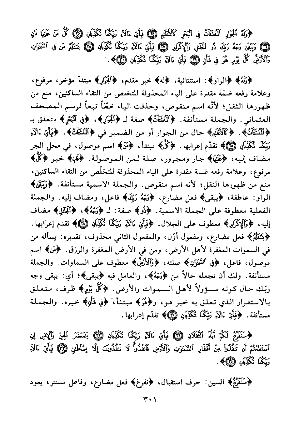 {وَلَهُ} {الواو}: استئنافية، {له} خبر مقدم، {الْجَوَارِ} مبتدأ موخر، مرفوع، وعلامة رفعه ضمّة مقدرة على الياء المحذوفة للتخلص من التقاء الساكنين، منع من ظهورها الثقل؛ لأنّه اسم منقوص، وحذفت الياء خطًّا تبعًا لرسم المصحف العثماني. والجملة مستأنفة. {الْمُنْشَآتُ} صفة لـ {الْجَوَارِ}، {فِي الْبَحْرِ} متعلق بـ {الْمُنْشَآتُ}. {كَالْأَعْلَامِ} حال من الجوار أو من الضمير في {الْمُنْشَآتُ}. {فَبِأَيِّ آلَاءِ رَبِّكُمَا تُكَذِّبَانِ} تقدّم إعرابها. {كُلُّ} مبتدأ، {مَنْ} اسم موصول، في محل الجر مضاف إليه، {عَلَيْهَا} جار ومجرور، صلة لمن الموصولة. {فَانٍ} خبر {كُلُّ} مرفوع، وعلامة رفعه ضمة مقدرة على الياء المحذوفة للتخلّص من التقاء الساكنين، منع من ظهورها الثقل؛ لأنه اسم منقوص. والجملة الاسمية مستأنفة. {وَيَبْقَى} الواو: عاطفة، {يَبْقَى} فعل مضارع، {وَجْهُ رَبِّكَ} فاعل، ومضاف إليه. والجملة الفعلية معطوفة على الجملة الاسمية {ذُو} صفة: لـ {وَجْهُ}، {الْجَلَالِ} مضاف إليه، {وَالْإِكْرَامِ} معطوف على الجلال. {فَبِأَيِّ آلَاءِ رَبِّكُمَا تُكَذِّبَانِ} تقدم إعرابها. {يَسْأَلُهُ} فعل مضارع، ومفعول أوّل، والمفعول الثاني محذوف، تقديره: يسأله من في السموات المغفرة لأهل الأرض، ومن في الأرض المغفرة والرزق. {مَنْ} اسم موصول، فاعل، {فِي السَّمَاوَاتِ} صلته، {وَالْأَرْضِ} معطوف على السماوات. والجملة مستأنفة. ولك أن تجعله حالًا من {وَجْهُ}، والعامل فيه {يَبْقَى}؛ أي: يبقى وجه ربّك حال كونه مسؤولًا لأهل السموات والأرض. {كُلَّ يَوْمٍ} ظرف، متعلق بالاستقرار الذي تعلق به خبر هو، و {هُوَ} مبتدأ {فِي شَأْنٍ} خبره. والجملة مستأنفة. {فَبِأَيِّ آلَاءِ رَبِّكُمَا تُكَذِّبَانِ} تقدّم إعرابها.