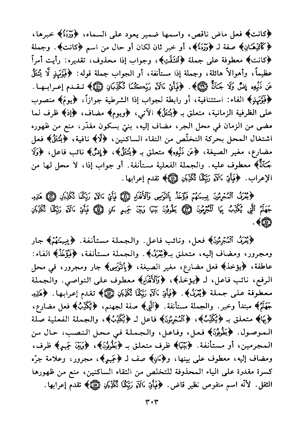 {يُعْرَفُ الْمُجْرِمُونَ} فعل، ونائب فاعل. والجملة مستأنفة. {بِسِيمَاهُمْ} جار ومجرور، ومضاف إليه، متعلق بـ {يُعْرَفُ}. والجملة مستأنفة، {فَيُؤْخَذُ} الفاء: عاطفة، {يؤخذ} فعل مضارع، مغير الصيغة، {بِالنَّوَاصِي} جار ومجرور، في محل الرفع، نائب فاعل، لـ {يؤخذ}، {وَالْأَقْدَامِ} معطوف على النواصي. والجملة معطوفة على جملة {يُعْرَفُ}. {فَبِأَيِّ آلَاءِ رَبِّكُمَا تُكَذِّبَانِ} تقدم إعرابها. {هَذِهِ جَهَنَّمُ} مبتدأ وخبر. والجملة مستأنفة. {الَّتِي} صفة لجهنم، {يُكَذِّبُ} فعل مضارع، {بِهَا} متعلق بـ {يُكَذِّبُ}، {الْمُجْرِمُونَ} فاعل لـ {يُكَذِّبُ}، والجملة الفعلية صلة الموصول. {يَطُوفُونَ} فعل، وفاعل، والجملة في محل النصب، حال من المجرمين، أو مستأنفة. {بَيْنَهَا} ظرف متعلق بـ {يَطُوفُونَ}، {وَبَيْنَ حَمِيمٍ} ظرف، ومضاف إليه، معطوف على بينها، و {آنٍ} صفة لـ {حَمِيمٍ}، مجرور، وعلامة جرّه كسرة مقدرة على الياء المحذوفة للتخلص من التقاء الساكنين، منع من ظهورها الثقل. لأنّه اسم منقوص نظير قاض. {فَبِأَيِّ آلَاءِ رَبِّكُمَا تُكَذِّبَانِ} تقدم إعرابها.