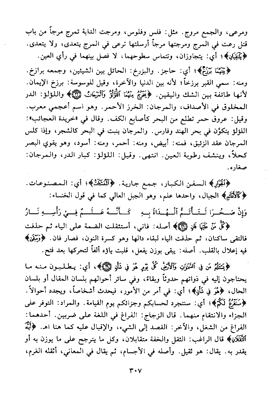 {بَيْنَهُمَا بَرْزَخٌ}؛ أي: حاجز. والبزرخ: الحائل بين الشيئين، وجمعه برازخ. ومنه: سمي القبر برزخًا؛ لأنه بين الدنيا والآخرة، وقيل للوسوسة: برزخ الإيمان. لأنها طائفة بين الشك واليقين. {يَخْرُجُ مِنْهُمَا اللُّؤْلُؤُ وَالْمَرْجَانُ (22)} واللؤلؤ: الدر المخلوق في الأصداف، والمرجان: الخرز الأحمر. وهو اسم أعجمي معرب. وقيل: عروق حمر تطلع من البحر كأصابع الكف. وقال في "خريدة العجائب": اللؤلؤ يتكوَّن في بحر الهند وفارس. والمرجان ينبت في البحر كالشجر، وإذا كلس المرجان عقد الزئبق، فمنه: أبيض، ومنه: أحمر، ومنه: أسود، وهو يقوي البصر كحلًا، وينشف رطوبة العين. انتهى. وقيل: اللؤلؤ: كبار الدر، والمرجان: صغاره.