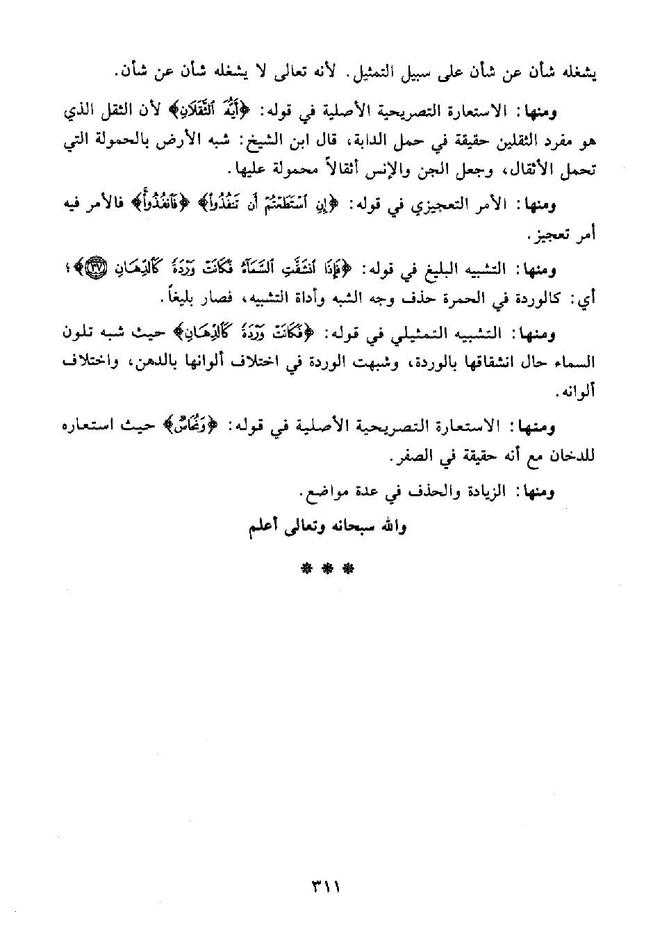 ومنها: الاستعارة التصريحية الأصلية في قوله: {أَيُّهَ الثَّقَلَانِ} لأن الثقل الذي هو مفرد الثقلين حقيقة في حمل الدابة، قال ابن الشيخ: شبه الأرض بالحمولة التي تحمل الأثقال، وجعل الجن والإنس أثقالًا محمولة عليها.
