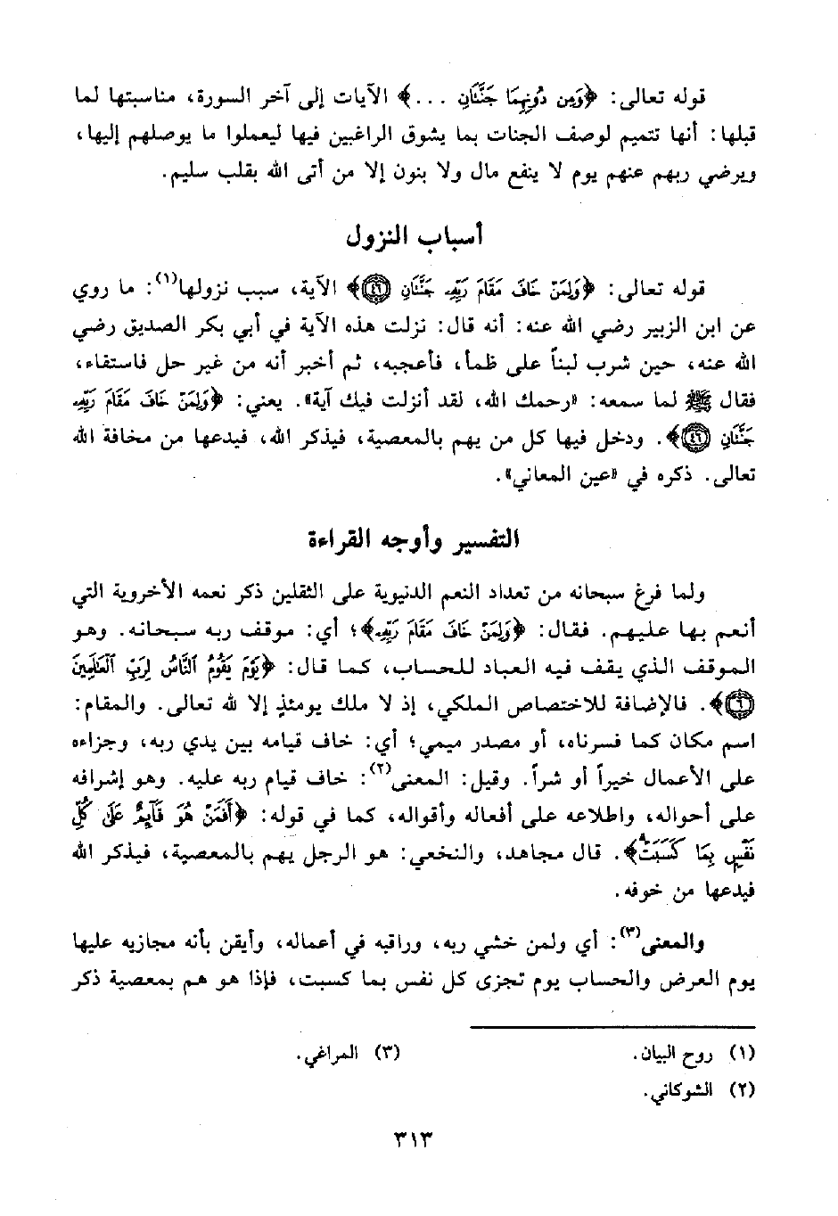 46 - ولما فرغ سبحانه من تعداد النعم الدنيوية على الثقلين ذكر نعمه الأخروية التي أنعم بها عليهم. فقال: {وَلِمَنْ خَافَ مَقَامَ رَبِّهِ}؛ أي: موقف ربه سبحانه. وهو الموقف الذي يقف فيه العباد للحساب، كما قال: {يَوْمَ يَقُومُ النَّاسُ لِرَبِّ الْعَالَمِينَ (6)}. فالإضافة للاختصاص الملكي، إذ لا ملك يومئذٍ إلا لله تعالى. والمقام: اسم مكان كما فسرناه، أو مصدر ميمي؛ أي: خاف قيامه بين يدي ربه، وجزاءه على الأعمال خيرًا أو شرًا. وقيل: المعنى (¬2): خاف قيام ربه عليه. وهو إشرافه على أحواله, واطلاعه صلى أفعاله وأقواله, كما في قوله: {أَفَمَنْ هُوَ قَائِمٌ عَلَى كُلِّ نَفْسٍ بِمَا كَسَبَتْ}. قال مجاهد، والنخعي: هو الرجل يهم بالمعصية، فيذكر الله فيدعها من خوفه.