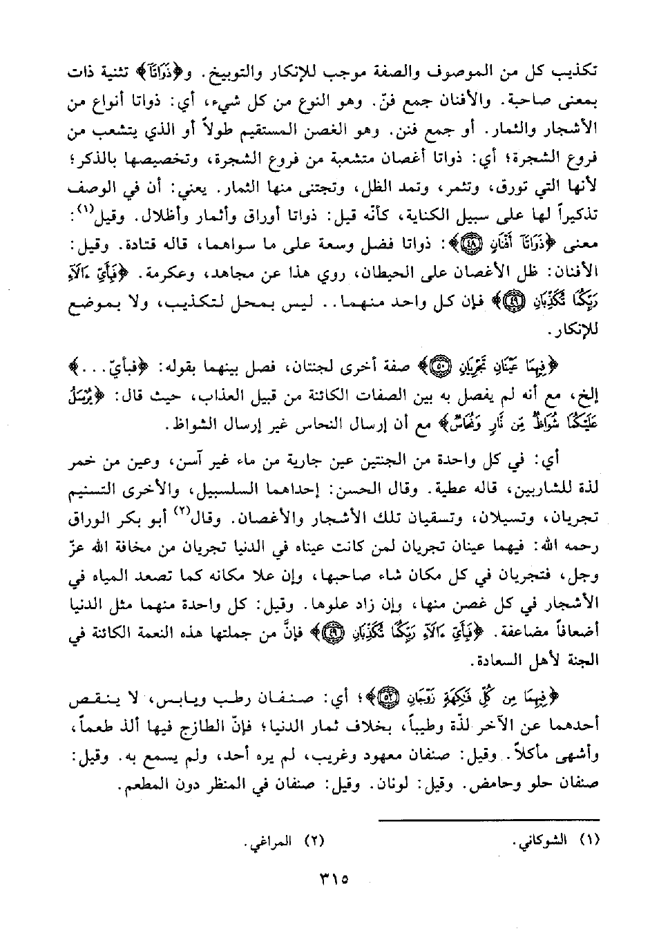 تكذيب كل من الموصوف والصفة موجب للإنكار والتوبيخ. و {ذَوَاتَا} تثنية ذات بمعنى صاحبة. والأفنان جمع فنّ. وهو النوع من كل شيء، أي: ذواتا أنواع من الأشجار والثمار. أو جمع فنن. وهو الغصن المستقيم طولًا أو الذي يتشعب من فروع الشجرة؛ أي: ذواتا أغصان متشعبة من فروع الشجرة، وتخصيصها بالذكر؛ لأنها التي تورق، وتثمر، وتمد الظل، وتجتنى منها الثمار. يعني: أن في الوصف تذكيرًا لها على سبيل الكناية، كأنّه قيل: ذواتا أوراق وأثمار وأظلال. وقيل (¬1): معنى {ذَوَاتَا أَفْنَانٍ (48)}: ذواتا فضل وسعة على ما سواهما, قاله قتادة. وقيل: الأفنان: ظل الأغصان على الحيطان، روي هذا عن مجاهد، وعكرمة.